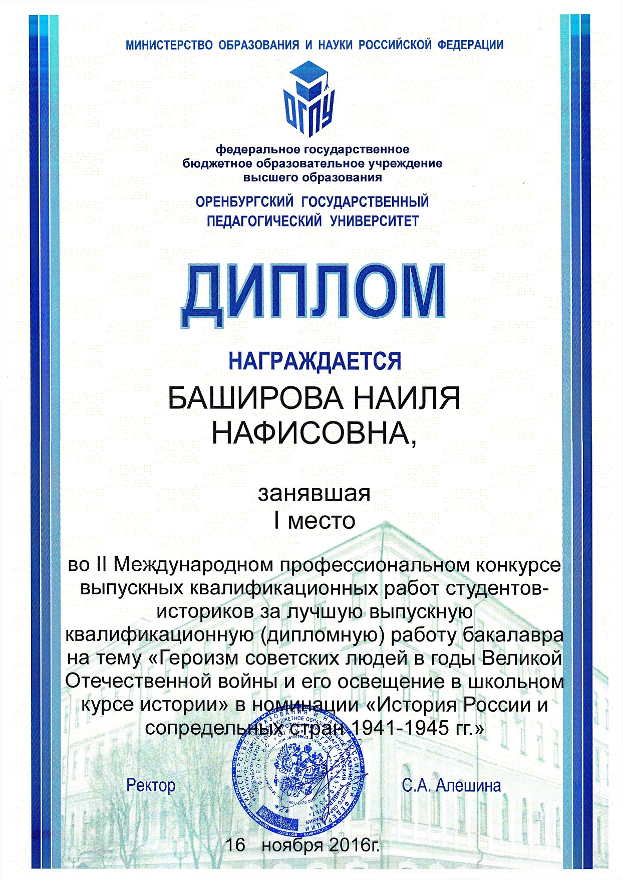 Лучшей работой в номинации «История России и сопредельных стран в 1941-1945 гг.» стала работа Башировой Наили Нафисовны «Героизм советских людей в годы Великой Отечественной войны и его освещение в школьном курсе истории». Научный руководитель к.и.н., доцент Р.З.Алмаев.