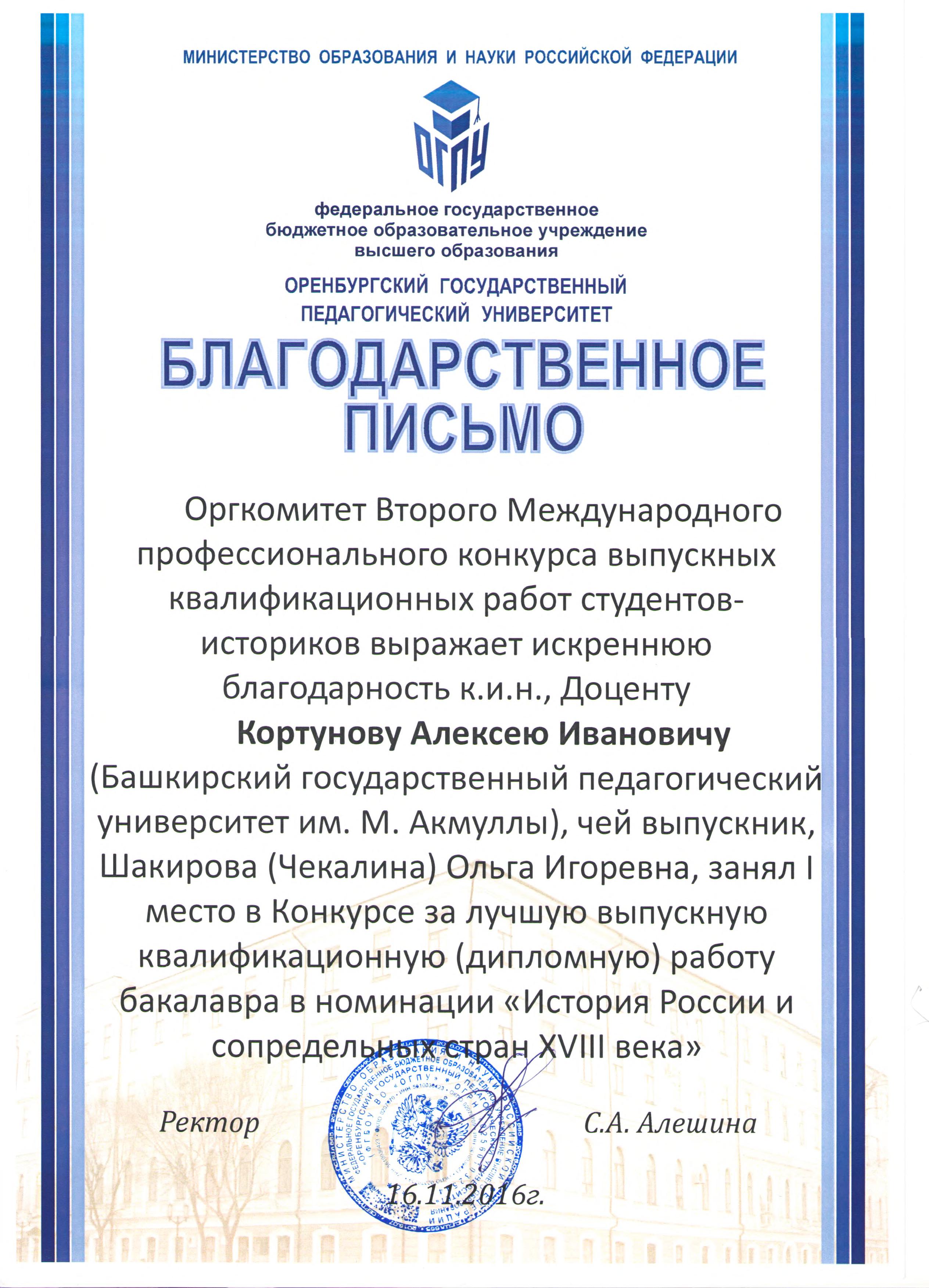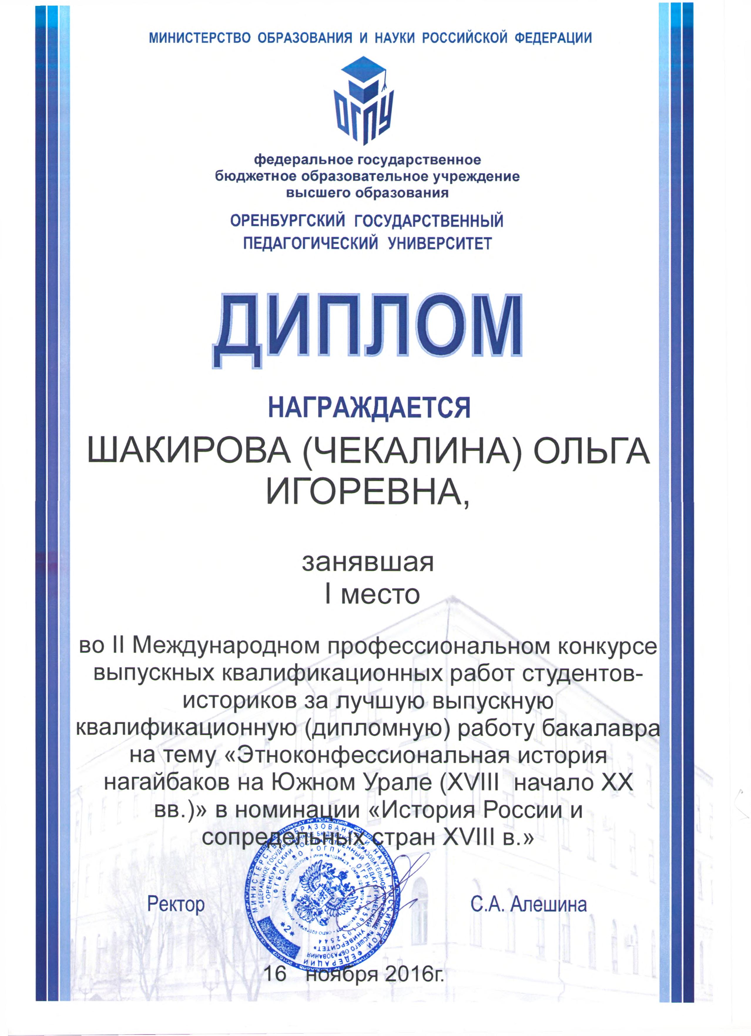 Победителем в номинации «История России и сопредельных стран XVIII века» признана работа Шакировой (Чекалиной) Ольги Игоревны «Этноконфессиональная история нагайбаков на Южном Урале в XVIII – начале XX вв.». Научный руководитель к.и.н., доцент А.И. Кортунов.
