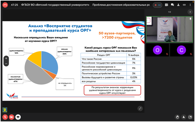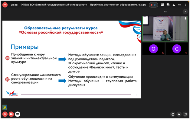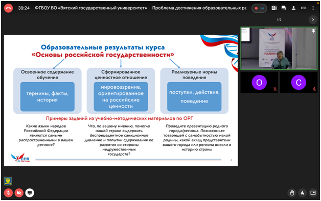 В мероприятиях конференции, в онлайн-формате приняла участие директор Института исторического, правового и социально-гуманитарного образования Башкирского государственного педагогического университета им.М.Акмуллы Оксана Алексеевна Шамигулова. Курс «Основы российской государственности» внедряется в вузах страны в течение двух лет и по итогам апробации и внедрения учебный предмет ждут обновления. В ИИПСГО, на кафедре Отечественной и всеобщей истории, реализующей данный курс в вузе, за этот период был подготовлен профессорско-преподавательский состав и ведется системная работа по совершенствованию учебно-методического сопровождения преподавания дисциплины с учетом направлений и профилей обучения студентов. Большое внимание в Институте в целом уделяется методическим вопросам предъявления содержания курса, обеспечения качества его освоения.
