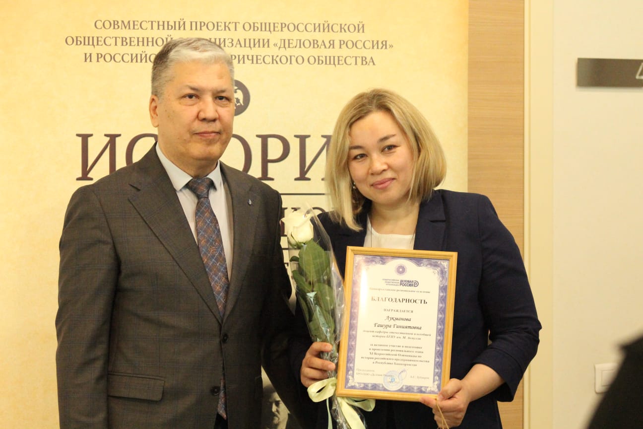 В торжественной обстановке Рафаэль Марданшин, Руслан Насретдинов и Альберт Гарипов вручили призерам регионального этапа Олимпиады почетные дипломы и ценные призы, а также благодарственные письма членам оргкомитета и преподавателям вузов за активное участие в организации и проведении регионального этапа XI Всероссийской олимпиады по истории российского предпринимательства в Республике Башкортостан. Среди членов оргкомитета - преподаватели кафедры отечественной и всеобщей истории И.Н. Баишев и Г.Г. Лукманова.