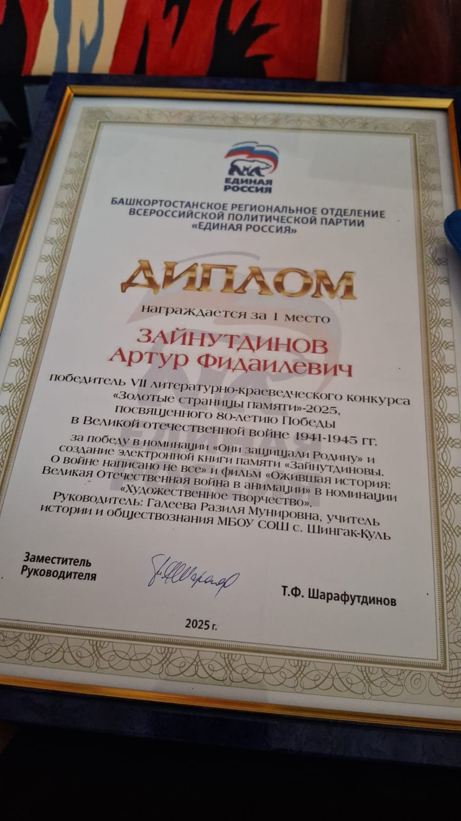 25 апреля 2025 г. на базе Уфимского общества краеведов имени Флюры Ахмеровой Общероссийской общественной организации "Союз краеведов России" прошел VII Республиканский литературно-краеведческий детско-юношеский конкурс «Золотые страницы памяти» (ХХ Ахмеровские краеведческие чтения). Студент 1 курса направления История и обществознание Артур Зайнутдинов стал победителем сразу в двух номинациях:
