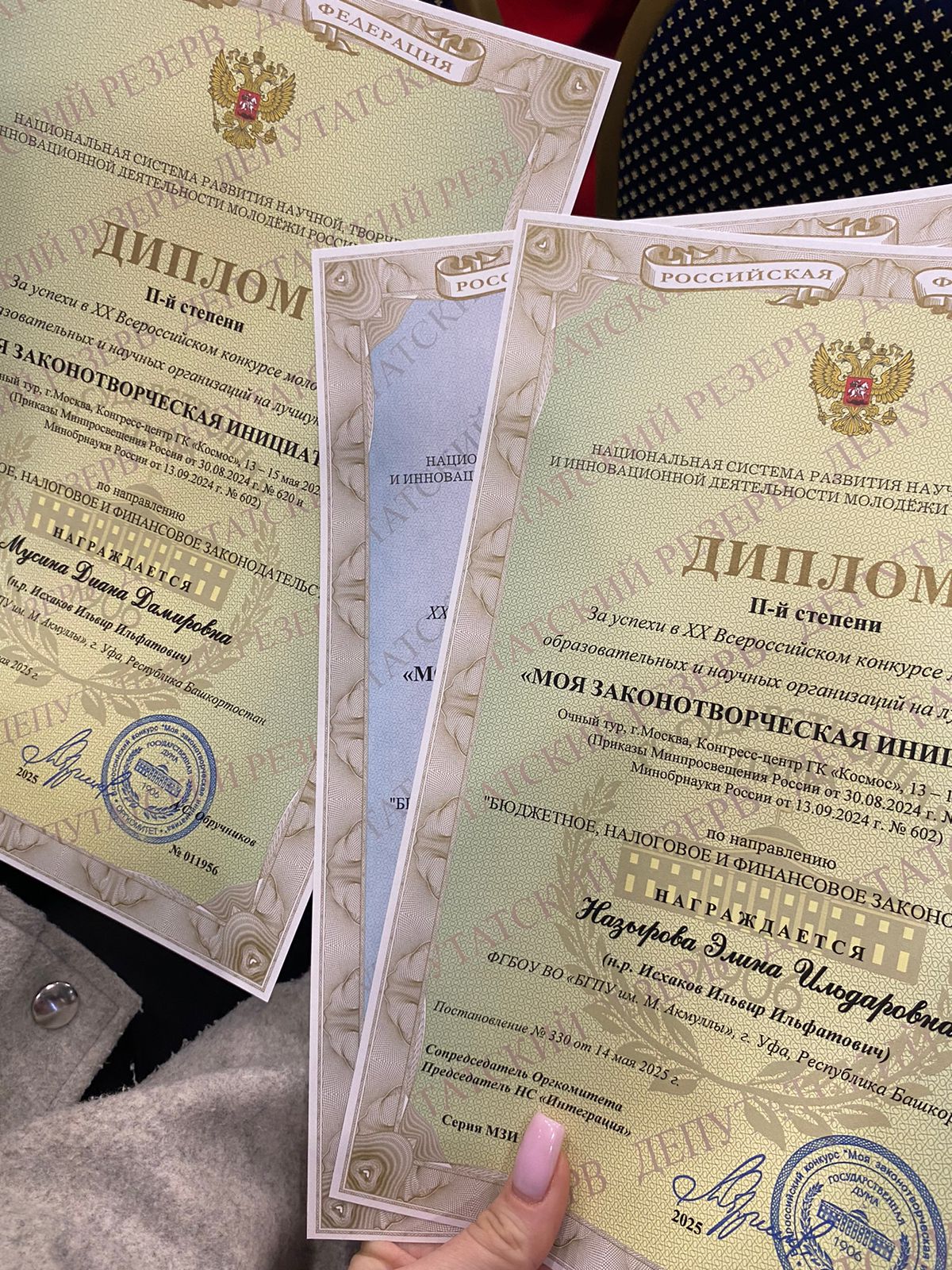 13-14 мая 2025 года в г. Москва прошёл XX Всероссийский конкурс молодежи образовательных и научных организаций на лучшую работу «Моя законотворческая инициатива». Учредителями и организаторами являются Государственная Дума России и Национальная система развития научной, творческой и инновационной деятельности молодежи России «Интеграция».