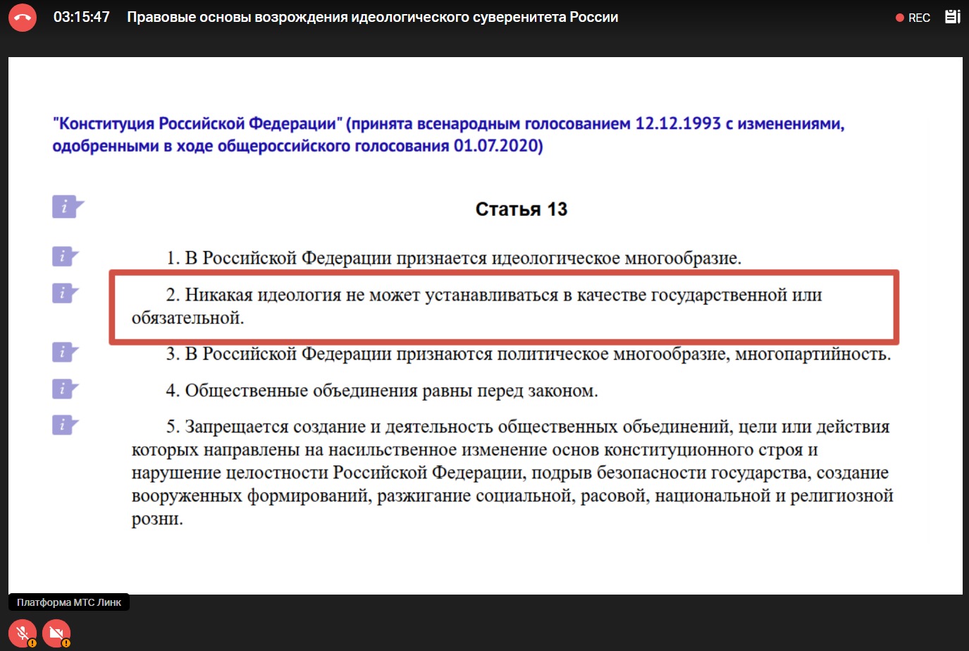 В ходе лекции на тему «Правовые основы возрождения идеологического суверенитета России» Евгений Николаевич представил слушателям актуальные исследования и озвучил важные правовые аспекты. Участниками мероприятия стали преподаватели и студенты различных вузов России, которые проявили живой интерес к обсуждаемой теме.