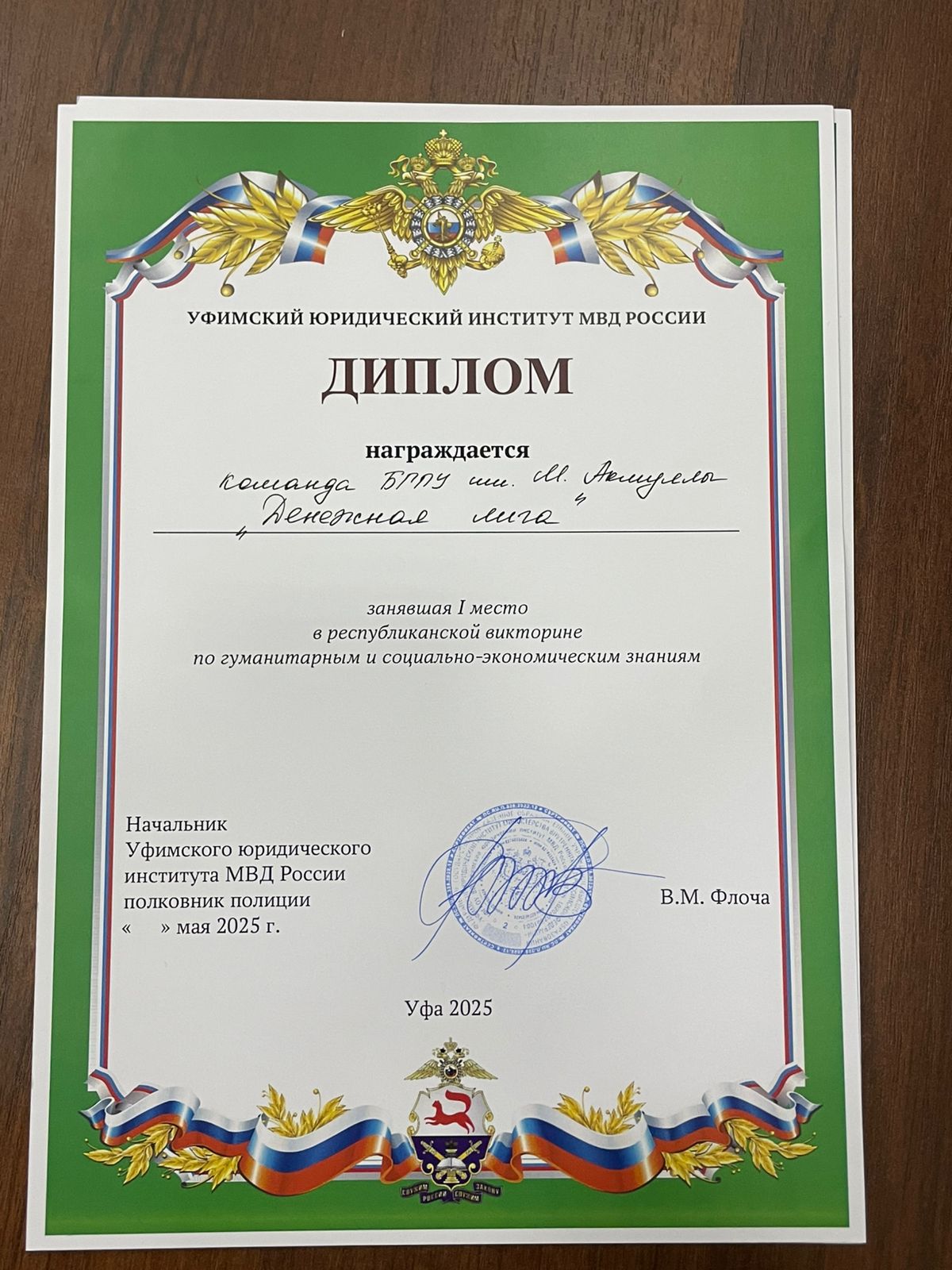 От Акмуллинского университета выступила команда «Золотая лига» из студентов 2 курса Института исторического, правового и социально-гуманитарного образования, участников Центра развития экономических компетенций «Ключевая точка» (состав команды: Арслангареева Аделя, Хабутдинова Регина, Дмитриева Ульяна, Бубновский Яромир, Бабаев Ярослав, Исмагилова Карина, Ахмадиева Валерия, Алексеева Ангелина, Низамова Лилиана, Баликаева Дарья; наставники команды – Лейля Наилевна Баянова, Дарья Сергеевна Василина). В результате подведения итогов викторины, команда одержала победу и была награждена дипломом I степени. Также дипломом «Лучший эрудит» была награждена капитан команды Баликаева Дарья.
