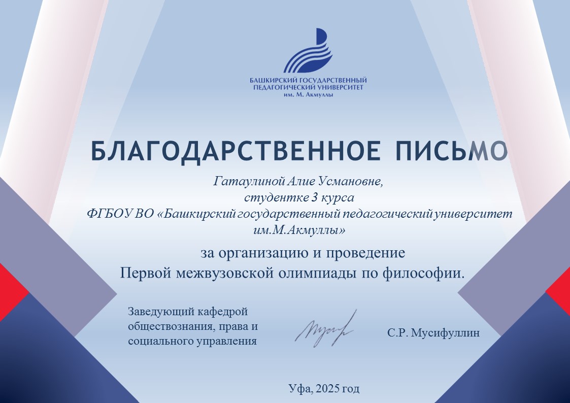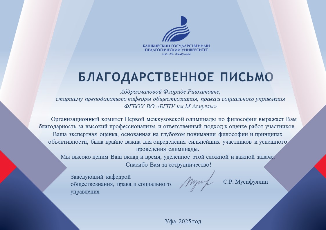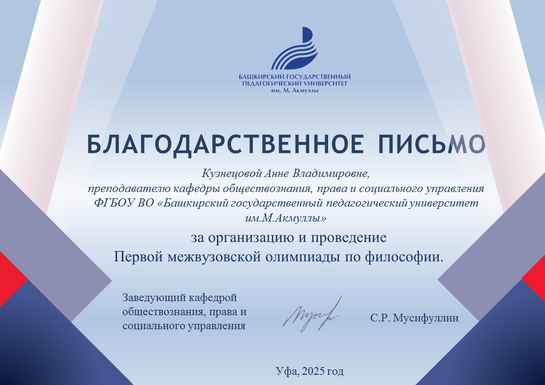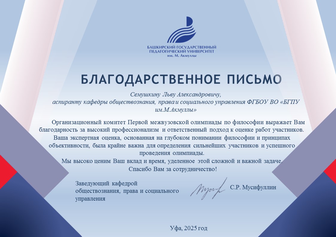 Организационный комитет первой межвузовской олимпиады по философии выражает искреннюю благодарность членам философского клуба «Генезис», преподавателям и аспирантам кафедры обществознания, права и социального управления за качественную организацию и проведение мероприятия.