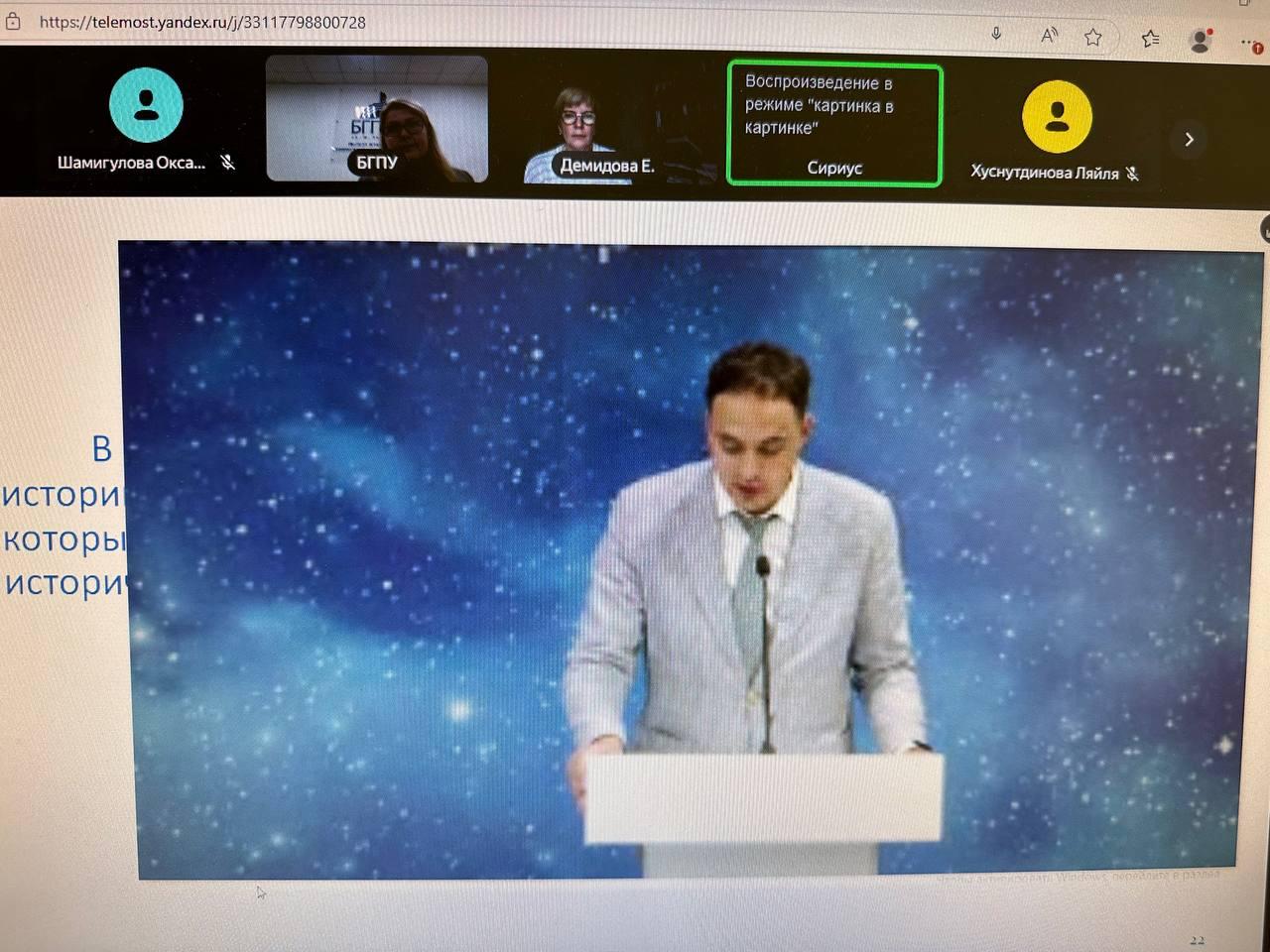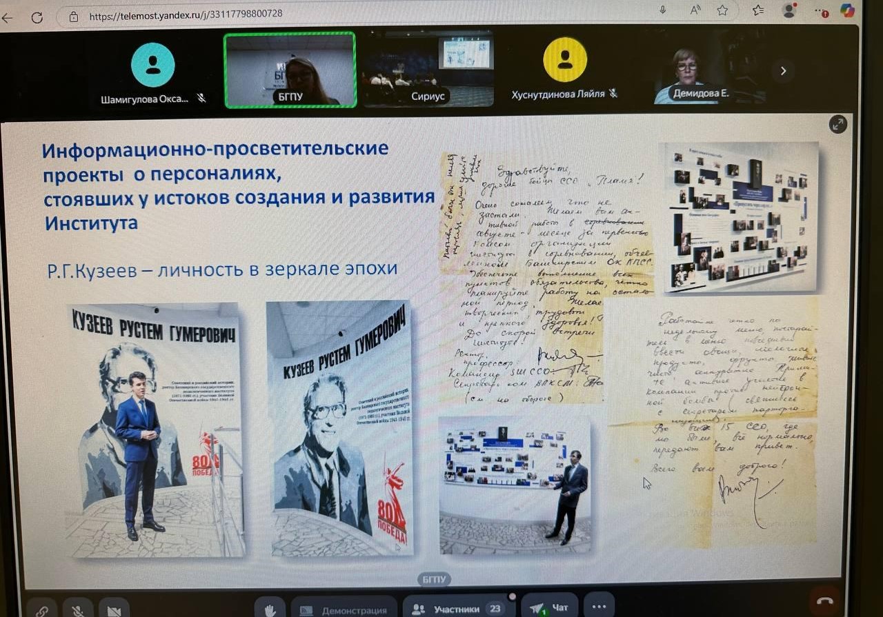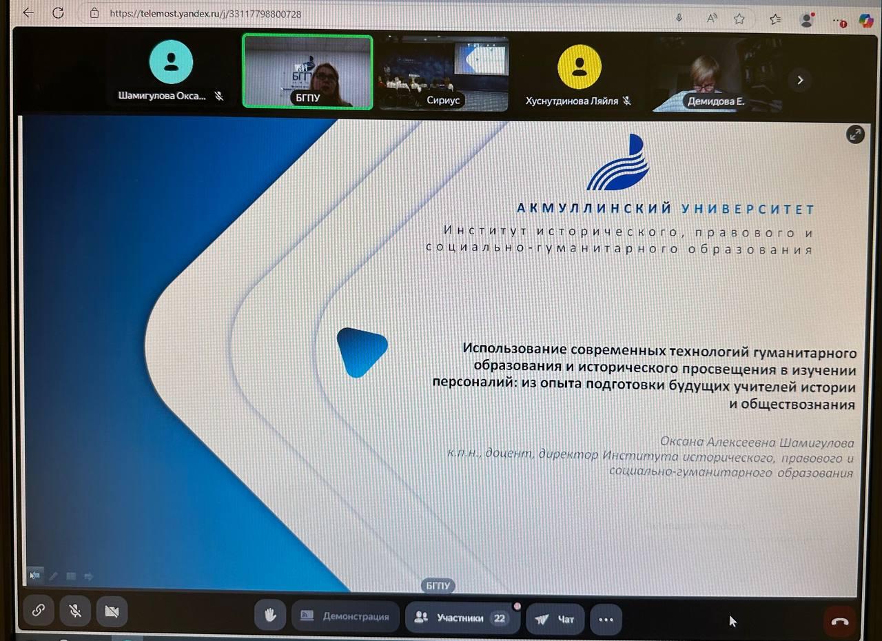 Опыт Башкирского государственного педагогического университета им.М.Акмуллы в реализации проектной, научно-исследовательской работы студентов, направленной на развитие технологий исторического просвещения, представила директор Института исторического, правового и социально-гуманитарного образования Оксана Шамигулова. В своем докладе она  обратила внимание на роль исторической  персоналистики в сохранении исторической памяти, уделила особое внимание системе подготовки будущих учителей истории и обществознания к решению задач воспитания историей, овладению студентами современными технологиями гуманитарного образования и цифровыми инструментами, познакомила с некоторыми результатами студенческих исследовательских работ.