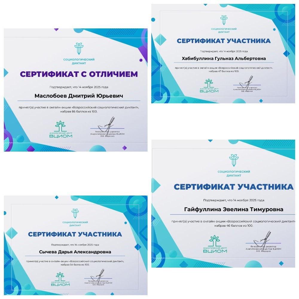 14 ноября 2025 г. участники философского клуба "Генезис" и студенты второго курса группы ПООБ-ПР-21-24 приняли участие в ежегодном Социологическом диктанте. Мы участвуем в этом мероприятии уже третий год и можем отметить, что в этот раз, как и в прошлые годы, были такие же примечательные и сложные вопросы,  на которые было интересно отвечать. Ребята получили сертификаты участников, а двое студентов - Маслобоев Дмитрий и Шматов Владислав - сертификаты с отличием, набрав по 96 баллов из 100! Поздравляем Вас, уважаемые студенты!
