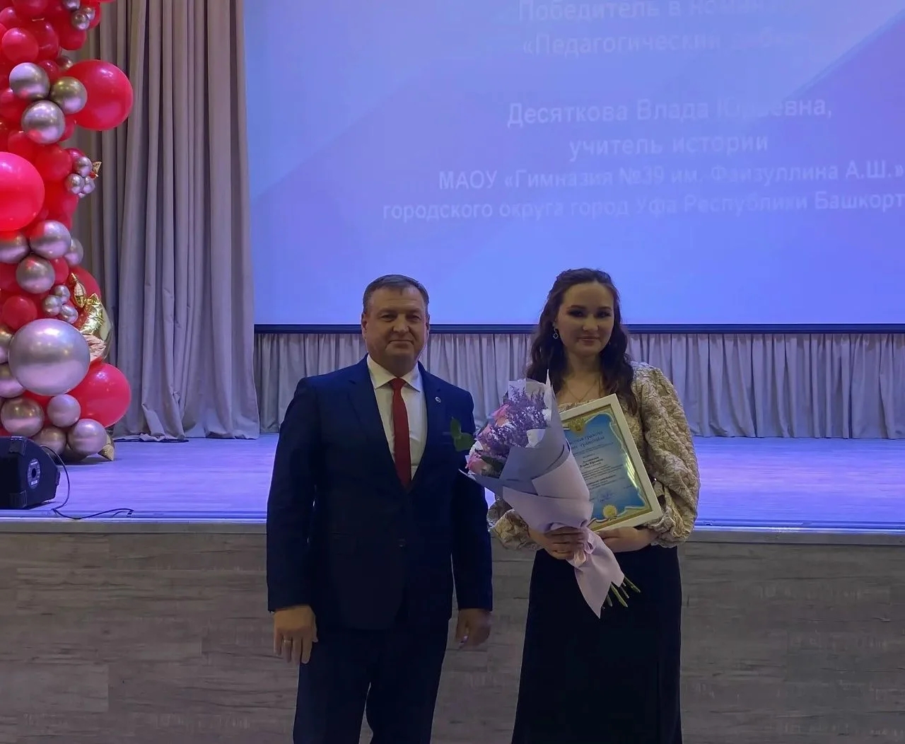 Десяткова Влада Юрьевна - учитель истории и обществознания гимназии №39 имени Агзама Файзуллина стала абсолютным победителем районного этапа республиканского конкурса Ленинского района г. Уфы «Учитель года столицы Башкортостана – 2026»! Влада Десяткова выпускница Института исторического, правого и социального гуманитарного образования БГПУ им. Акмуллы. Она окончила магистратуру по направлению Педагогическое образование» профиль «Историческое образование и актуальные вопросы обществознания» в 2024 году. Желаем Владе Юрьевне Десятковой успехов на последующих этапах конкурса!