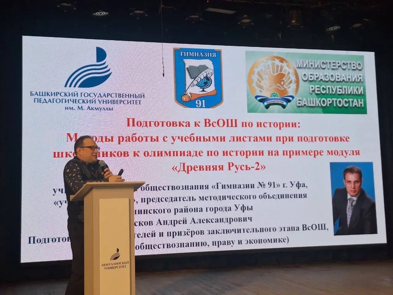 Носков Андрей Александрович, учитель истории и обществознания МАОУ «Гимназия №91 им. Н.А.Черных» г. Уфа с темой «Методы работы с дидактическими листами при подготовке школьников к олимпиаде по истории»;