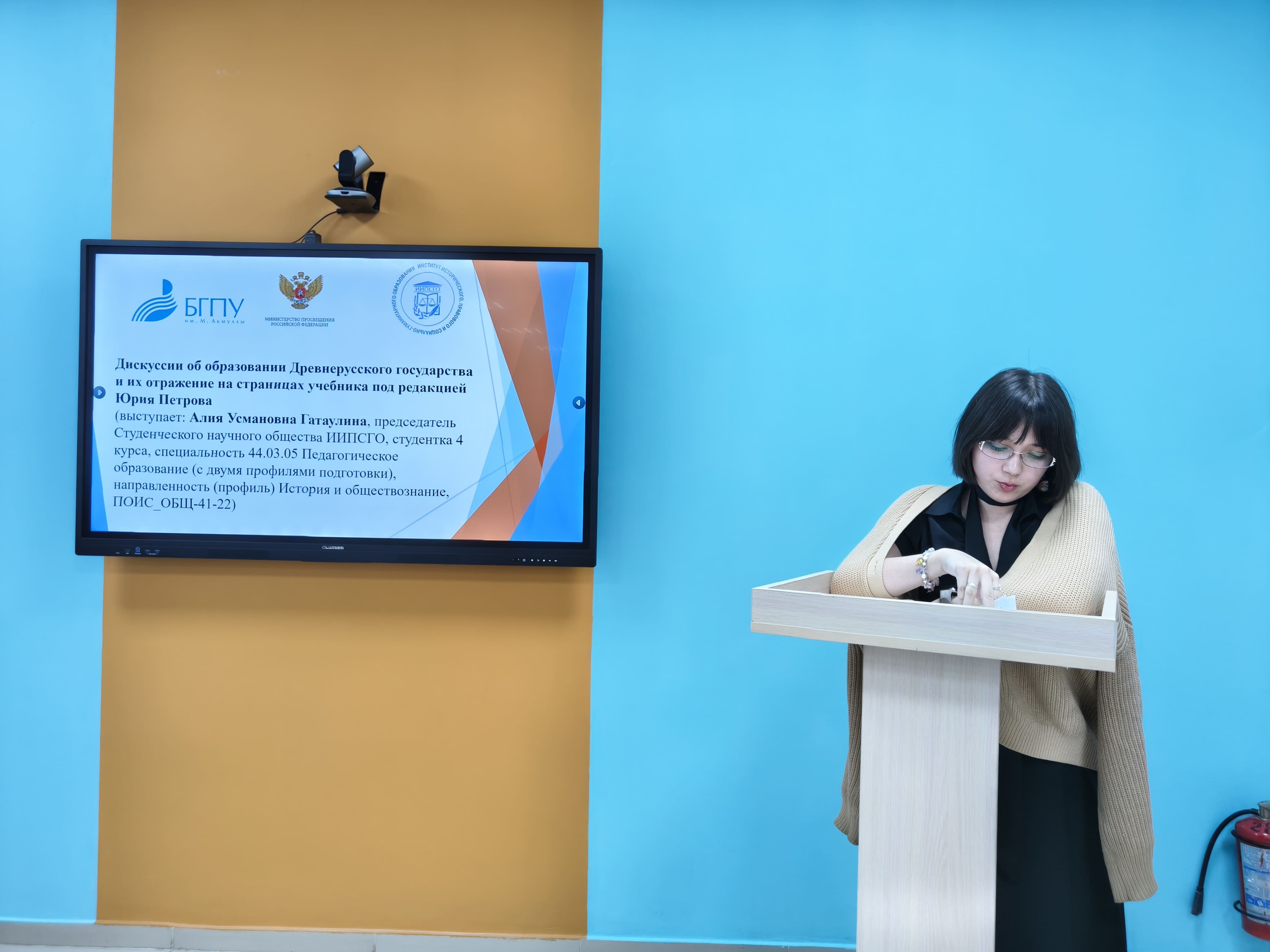 На обсуждение было вынесено три узловых вопроса отечественной истории. По первому вопросу с докладом на тему: «Концепция «Россия – государство-цивилизация» и её отражение в учебнике» выступил Алексей Олегович Иванов, кандидат исторических наук, старший преподаватель кафедры отечественной и всеобщей истории, который отметил важность данной концепции в контексте необходимости понимания исторического пути страны, а также для решения современных проблем, с которыми сталкивается наша страна. Второй вопрос «XIX век и особенности его отражения на страницах нового учебника «История России» осветил Ильдар Нариманович Баишев, кандидат исторических наук, доцент кафедры отечественной и всеобщей истории, акцентировавший внимание на том, что многие аспекты истории этого периода описаны не достаточно подробно, например, события Крымской войны 1853-1856 гг. Третий вопрос, связанный с «Дискуссиями об образовании Древнерусского государства и их отражением на страницах учебника под редакцией Юрия Петрова» изучила Алия Усмановна Гатаулина, председатель Студенческого научного общества ИИПСГО, студентка 4 курса. В своём выступлении она отметила, что данной теме в учебнике уделено 9 страниц, которые довольно подробно раскрывают различные стороны особенностей формирования Древнерусского государства. На страницах учебника имеются ссылки на соответствующие исторические источники, а также представлен анализ основных проблемных аспектов, которым часто не уделяется должное внимание, например, истоки названия государства, понятие государственности и процесса ее становления. В заключении участники отметили важность обсуждения учебника в формате дискуссии, поскольку это необходимо для совершенствования преподавания истории в вузах. Мероприятие было организовано Алексеем Олеговичем Ивановым совместно с активом Студенческого научного общества Института.
