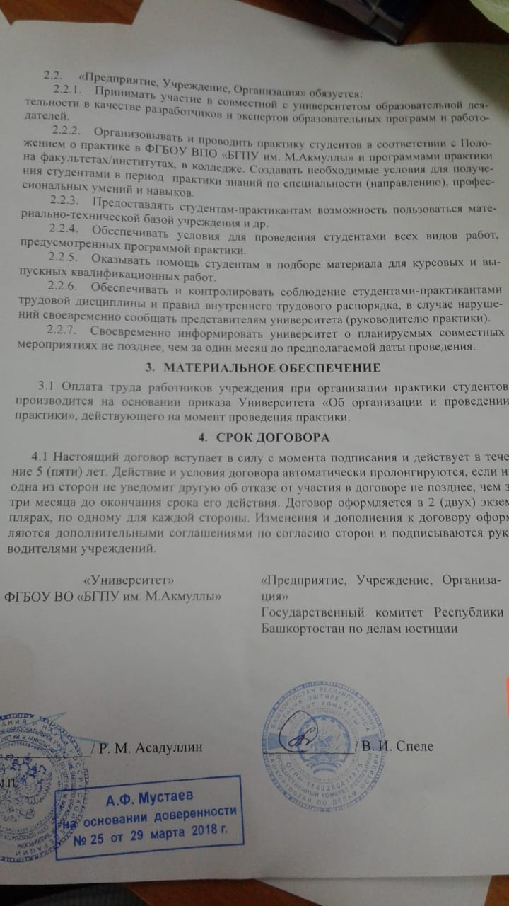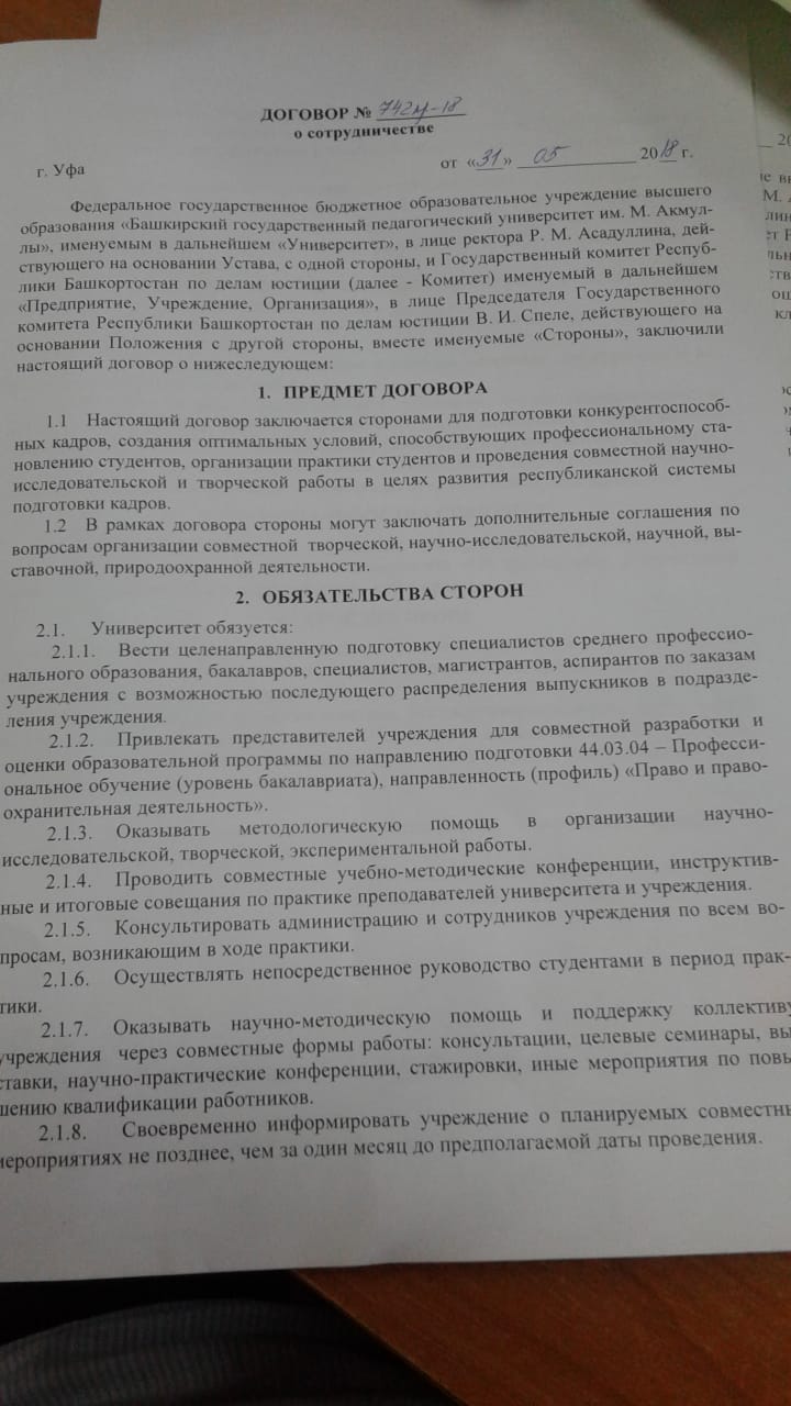 В рамках данного договора студенты - правоведы смогут пройти учебную (правовую) практику по направлению подготовки. Руководителем практики от вуза является к.ю.н., доцент кафедры Права и обществознания Г. Р. Ишкильдина.