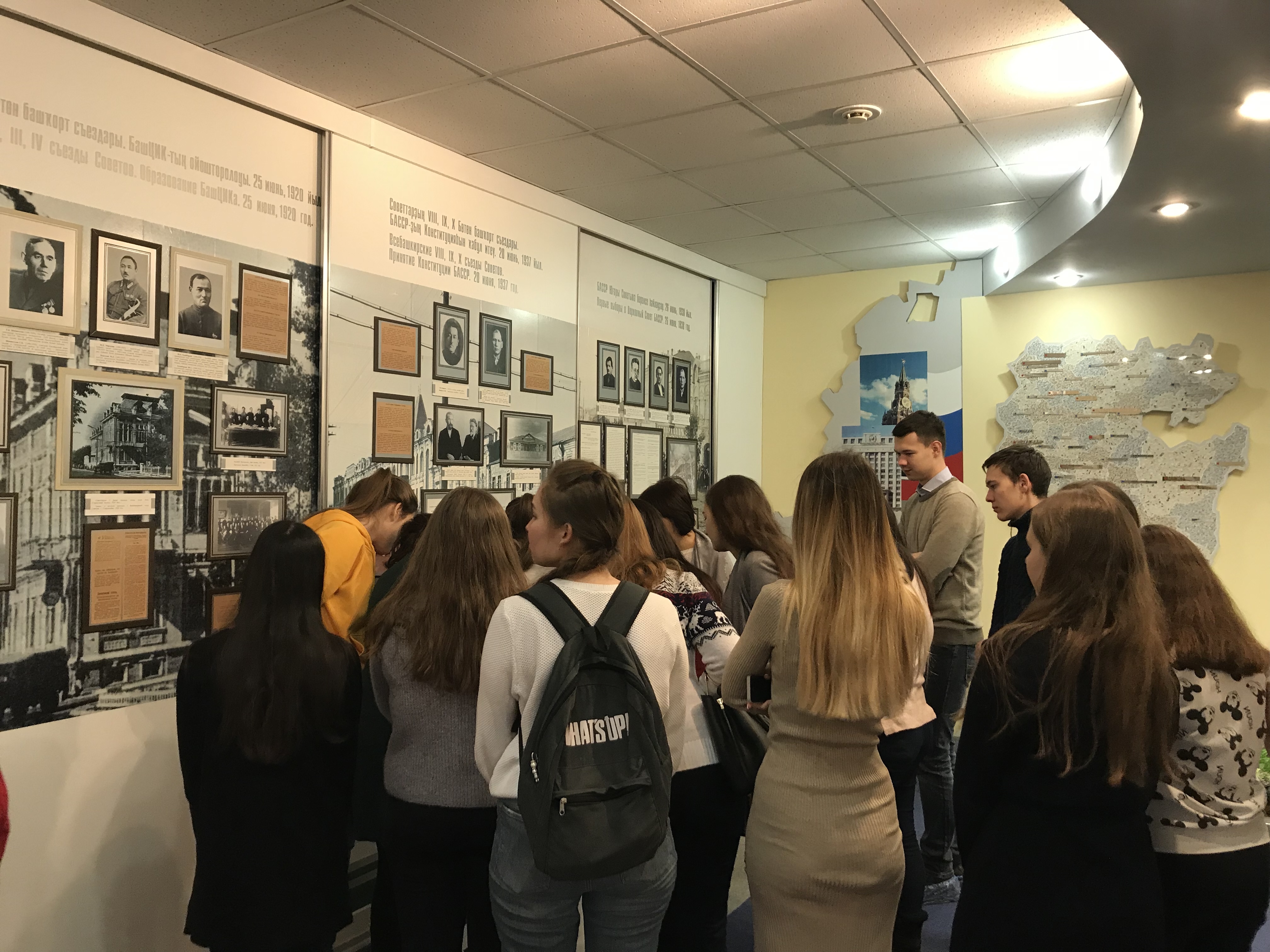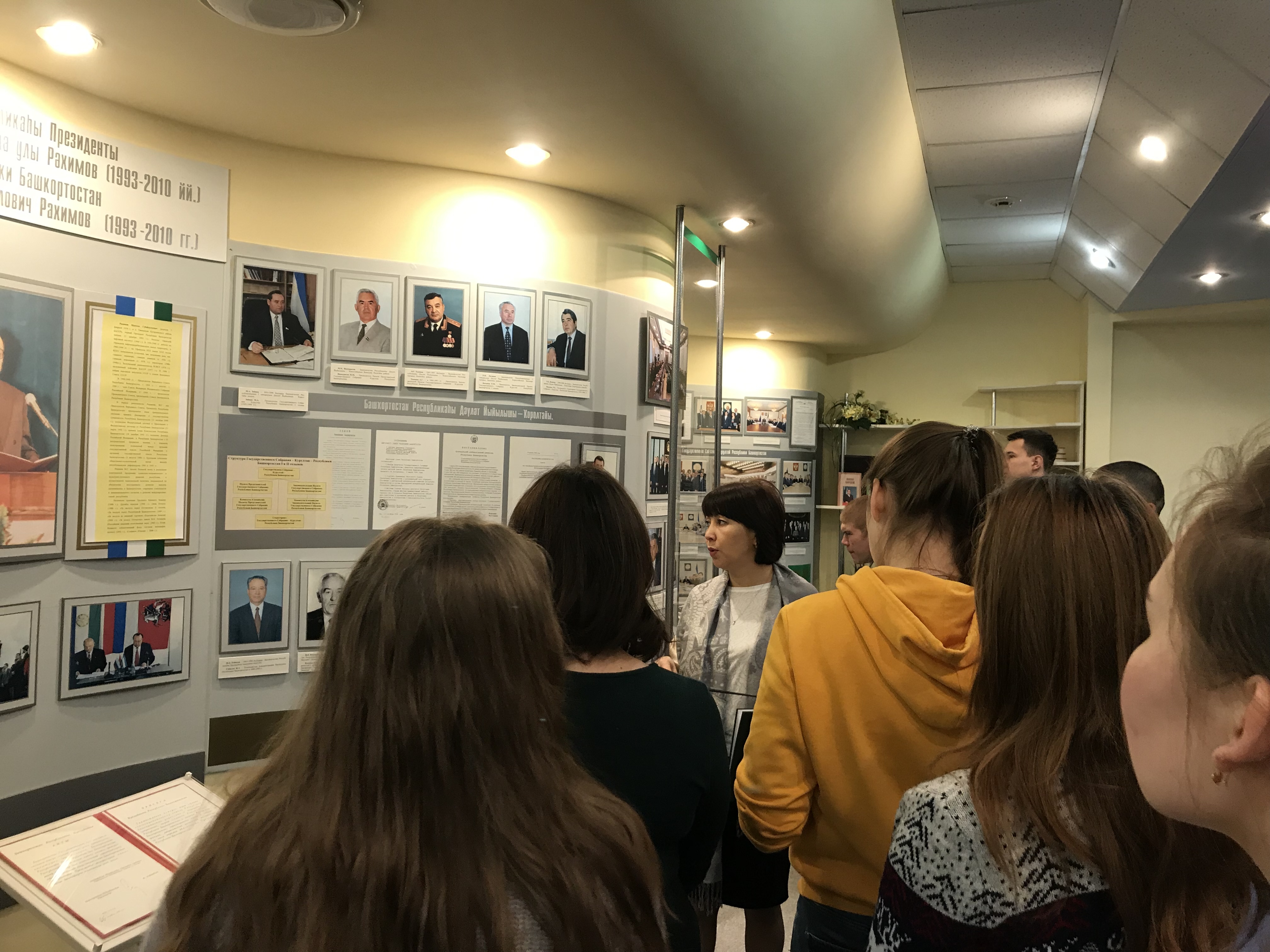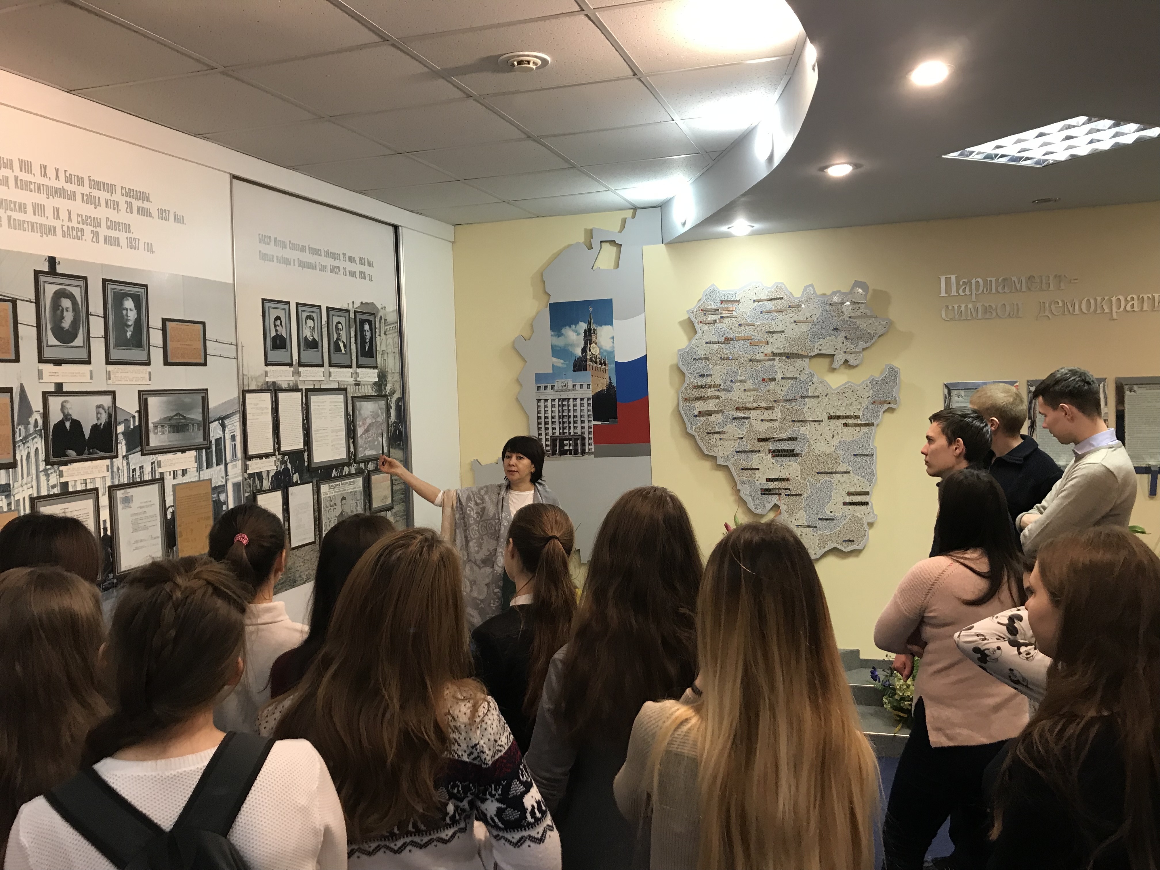 В просторном зале представлены экспонаты, отражающие столетнюю историю становления и развития парламентаризма в Башкортостане: документы, фотографии, книги, значки, публикации. У студентов была возможность побывать в зале заседаний, задать интересующие их вопросы экскурсоводу.