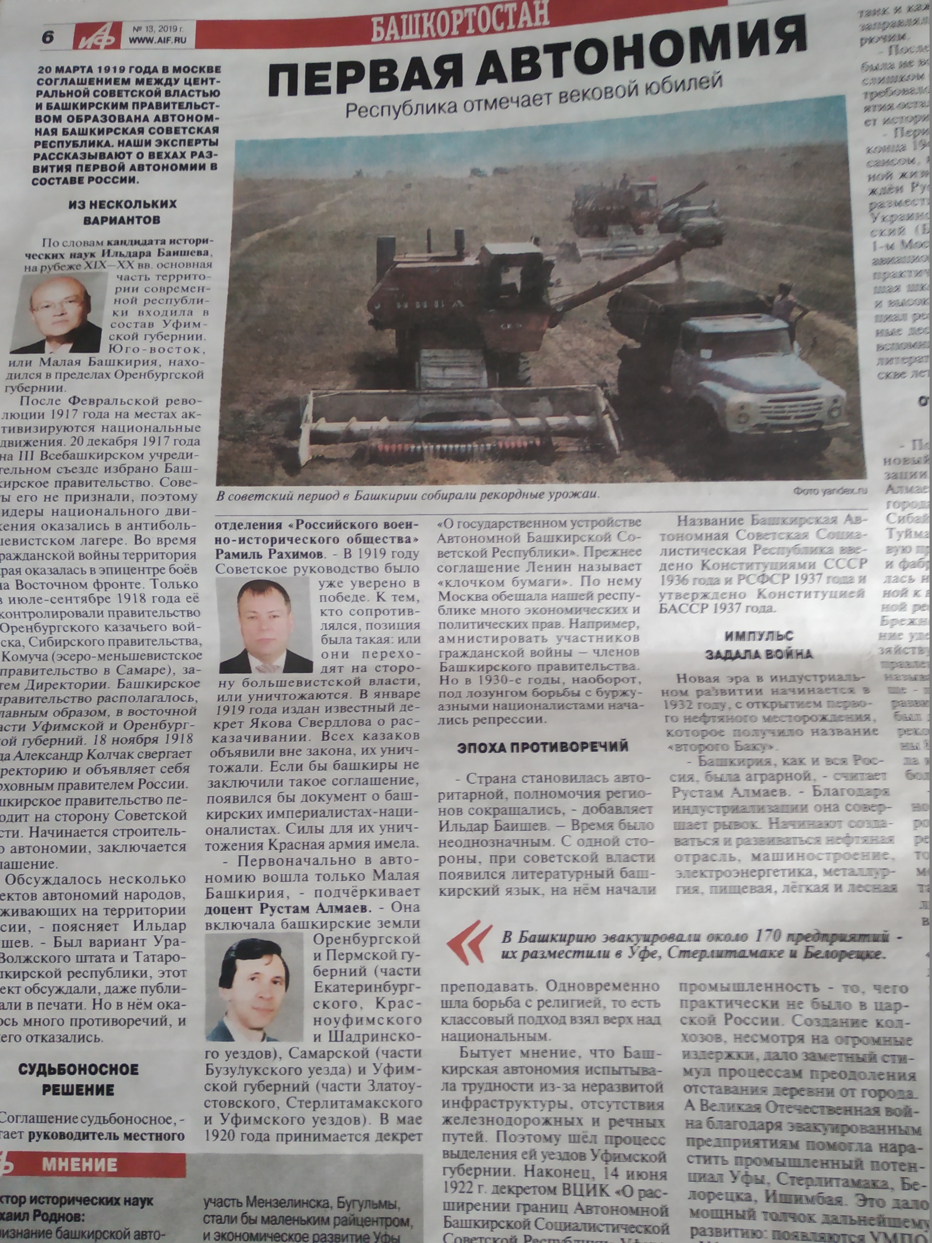 Преподаватели кафедры отечественной истории, кандидаты исторических наук, доценты Рустам Алмаев и Ильдар Баишев дали интервью корреспонденту газеты «Аргументы и факты» Алексею Шушпанову, посвященное созданию первой автономии в составе советского государства. Преподаватели, выступившие в качестве экспертов,  провели исторический экскурс, поделились своим мнением по поводу приобретений и потерь от «Соглашения центральной Советской власти и Башкирским правительством о советской автономии Башкирии», подписанного 20 марта 1919 г. Ученые-историки рассказали о вехах развития первой автономии в составе России.