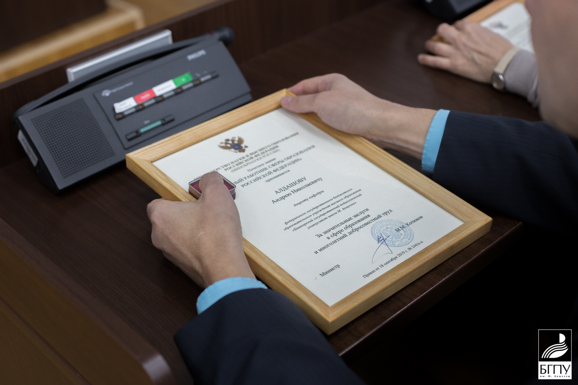 В этот день получили свои награды ведущие сотрудники Университета. Согласно приказу Минобрнауки России, за значительные заслуги в сфере образования и многолетний добросовестный труд звание «Почетный работник сферы образования Российской Федерации» присвоено (и вручен соответствующий знак отличия) доценту кафедры Всеобщей истории и культурного наследия Института исторического и правового образования Андрею Николаевичу Алдашову.