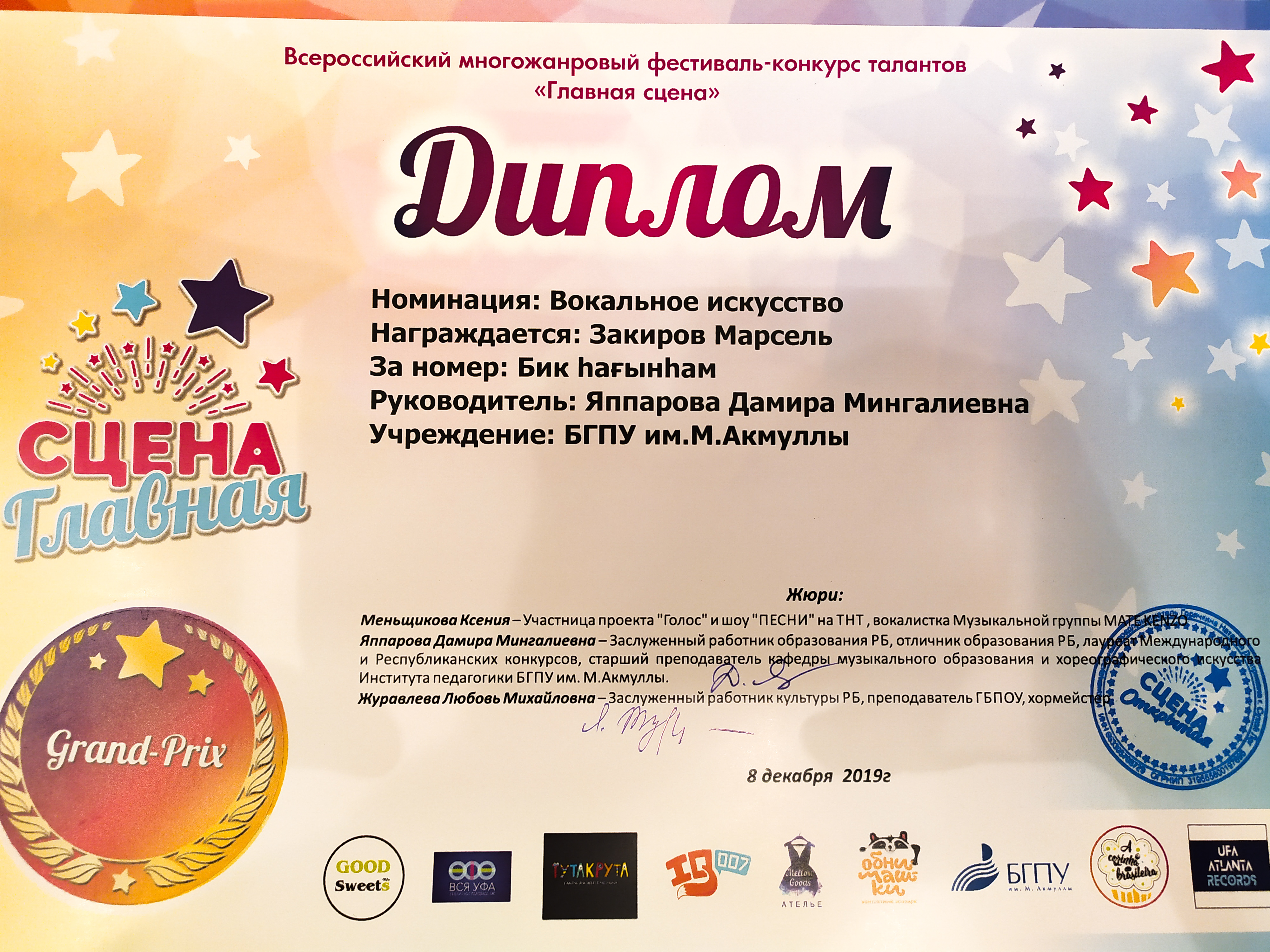 Марсель Закиров получил Гран-при на Всероссийском фестивале-конкурсе талантов "Главная сцена"