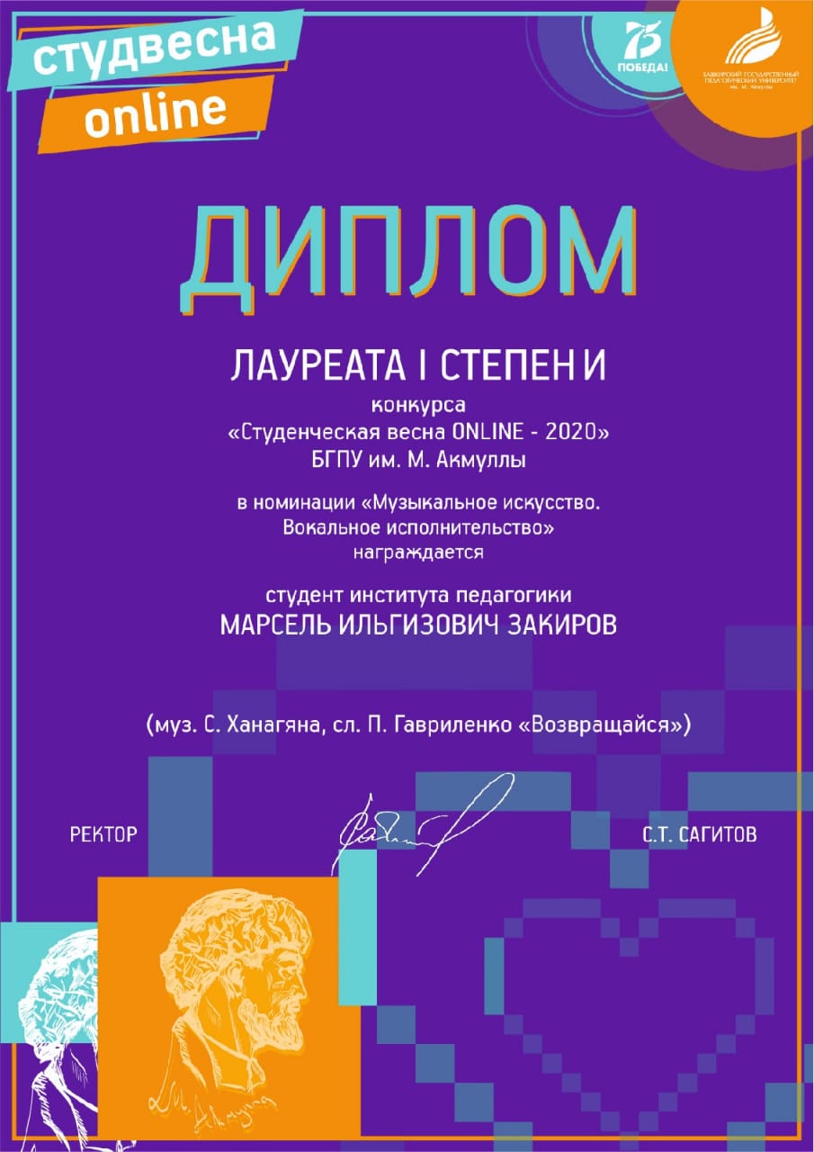 · Студенческая весна ONLINE 2020 БГПУ им.М Акмуллы - Лауреат 1 степени
