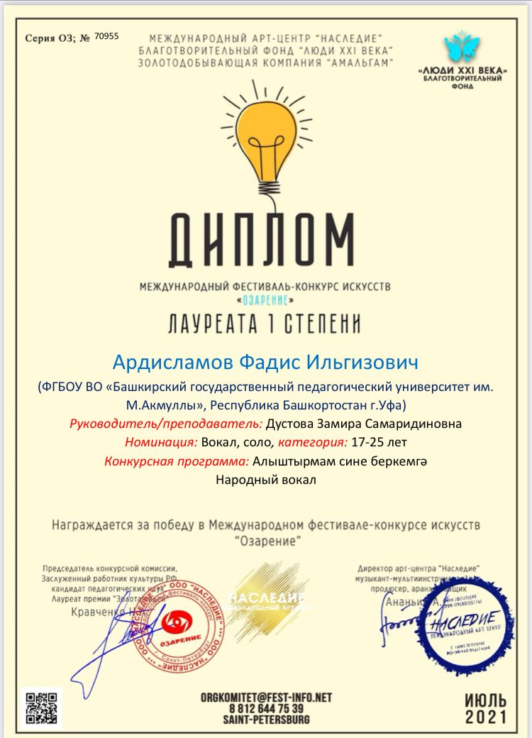 Ардисламов Фадис - Лауреат I степени в номинации "Народный вокал (соло)", категория: 17-25 лет;