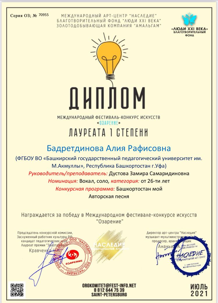 Бадретдинова Алия - Лауреат I степени в номинации "Авторская песня", категория: от 26 лет;