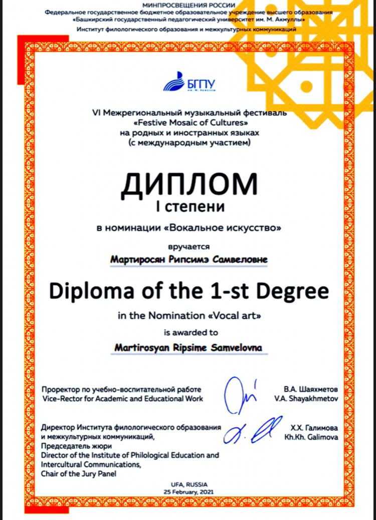 Мартиросян Рипсимэ - Лауреат I  степени.