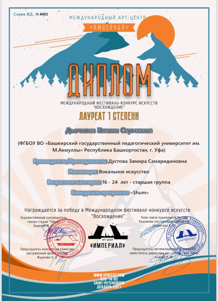 • Дьячкова Ксения -Лауреат I степени;
