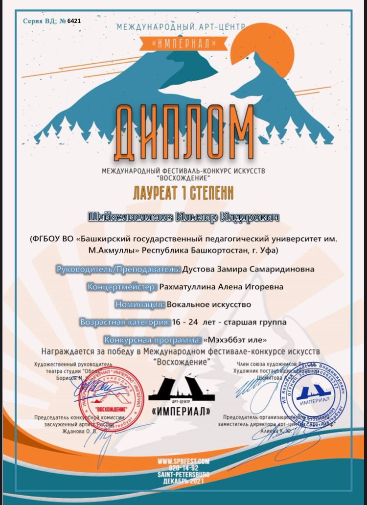• Шайхелисламов Ильмир - Лауреат I степени;