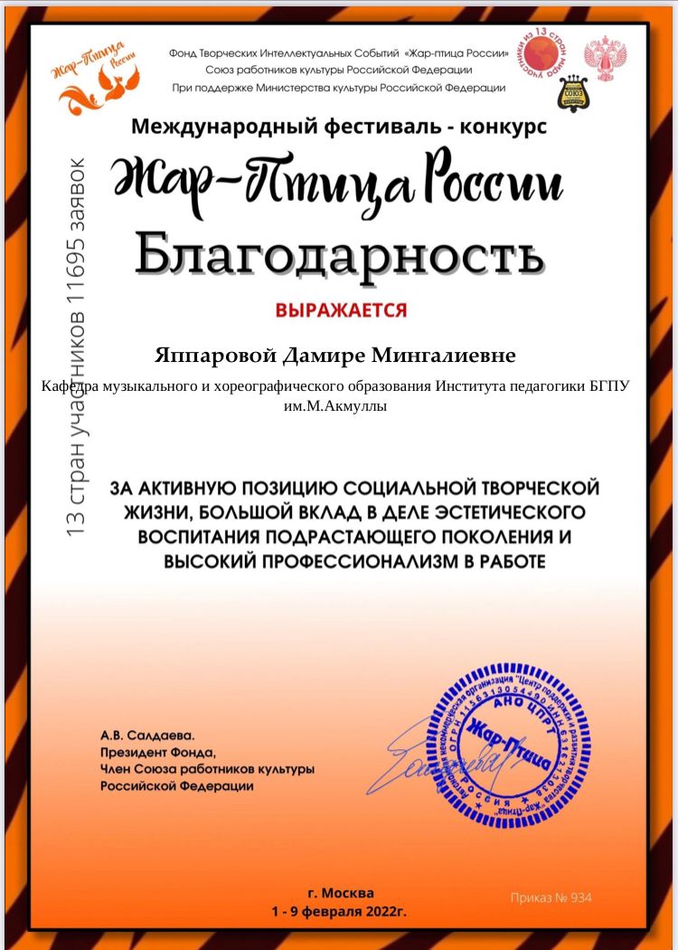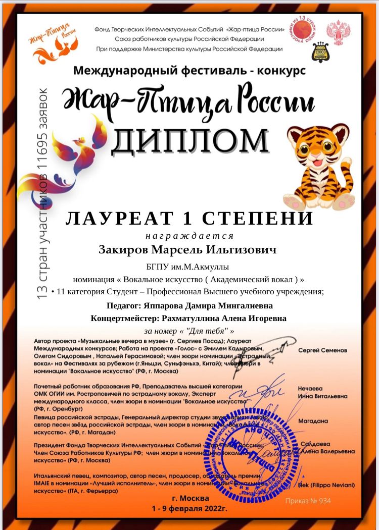Студент 3 курса кафедры МХО Закиров Марсель удостоился звания Лауреата I степени Международного фестиваля-конкурса "Жар-птица России", который проходил в г. Москва. Такую высокую награду Марсель получил за исполнение песни "Для тебя" в номинации "Вокальное искусство (Академический вокал)". Поздравляем студента, преподавателя Яппарову Дамиру Мингалиевну и концертмейстера Рахматуллину Алену Игоревну с достойным результатом!