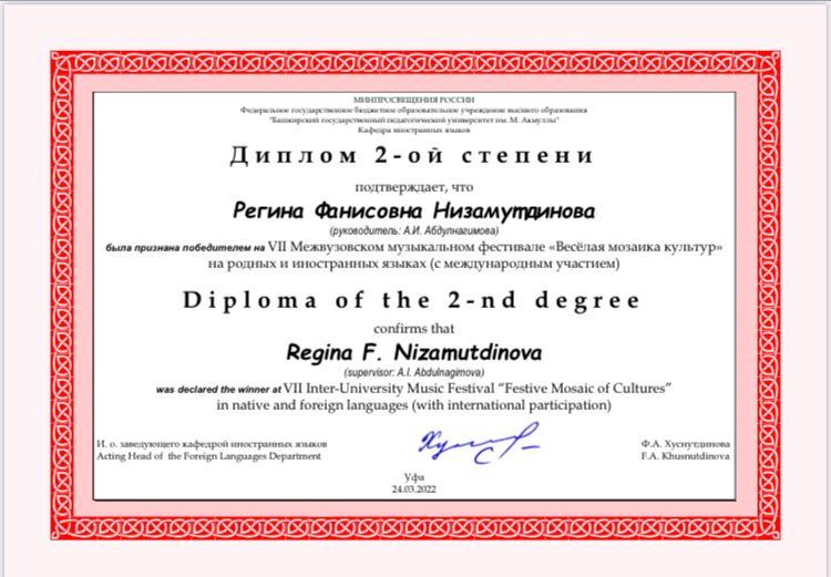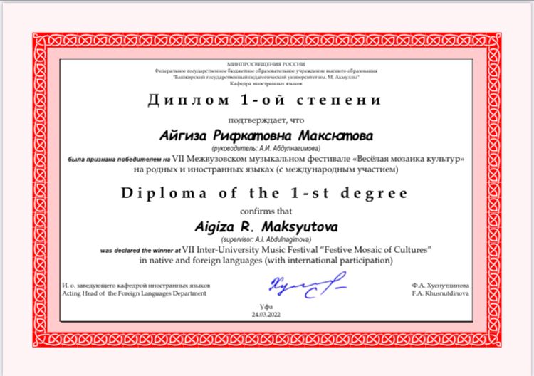 Студентка 5 курса кафедры МХО Айгиза Максютова и студентка 2 курса Низамутдинова Регина стали лауреатами I и II степени VII Межвузовского музыкального фестиваля «Веселая мозаика культур» на родных и иностранных языках (с международным участием) в номинации инструментальное исполнительство (фортепиано). Преподаватель-Абдулнагимова Адель Ирековна.