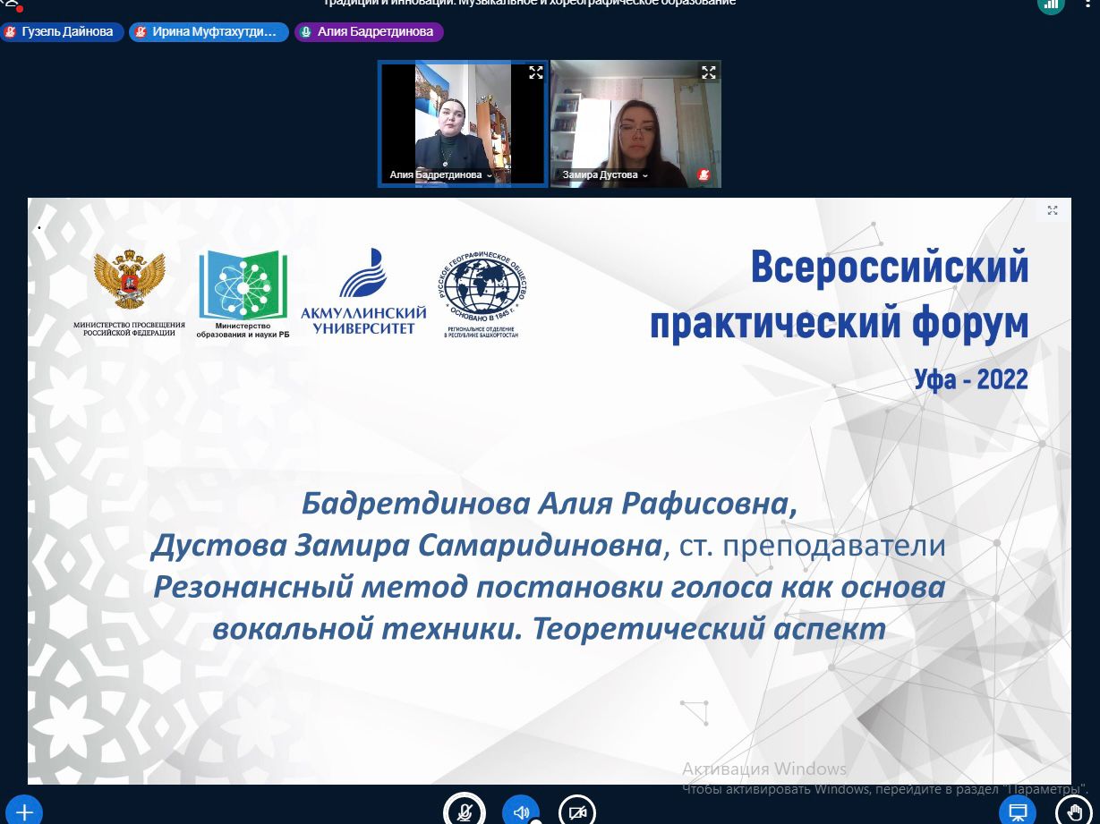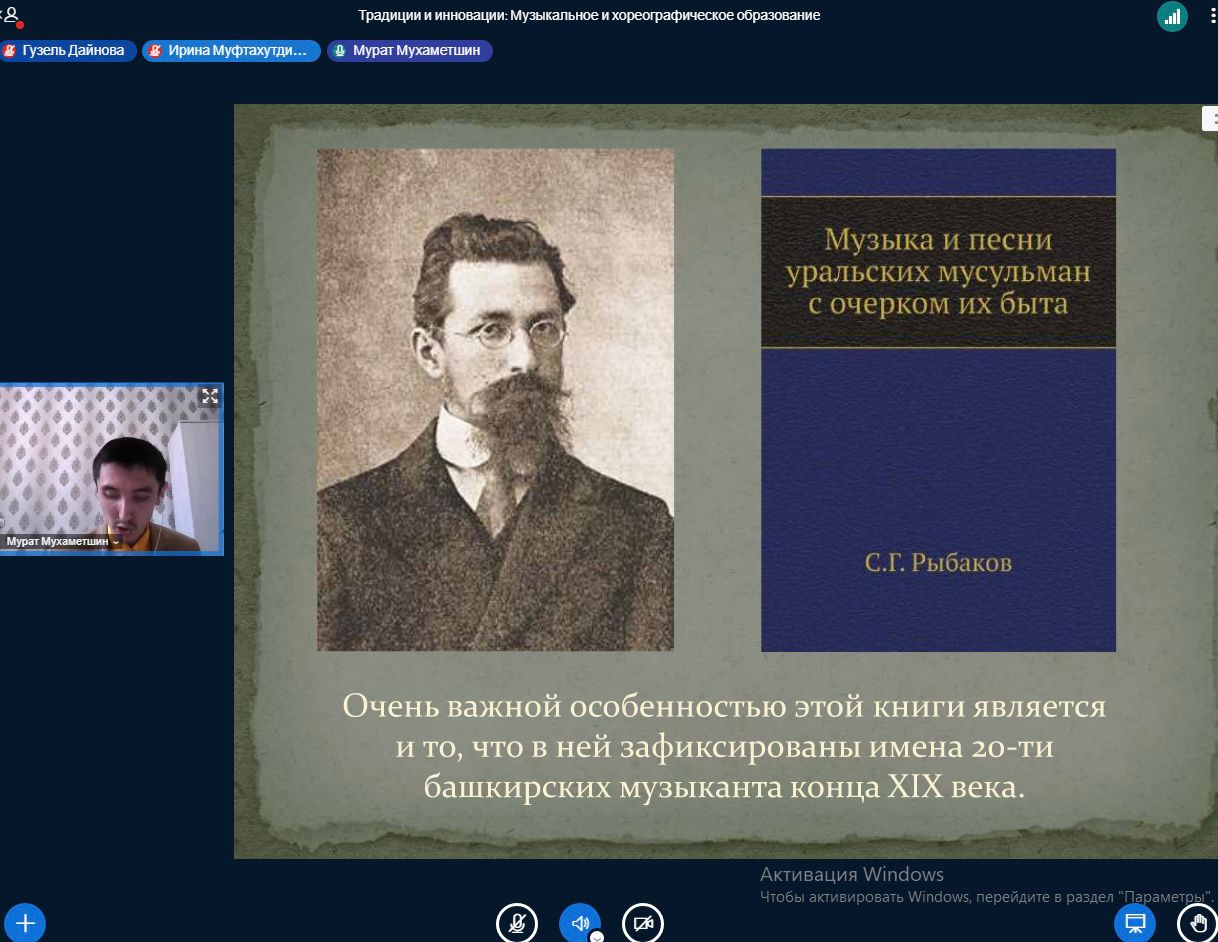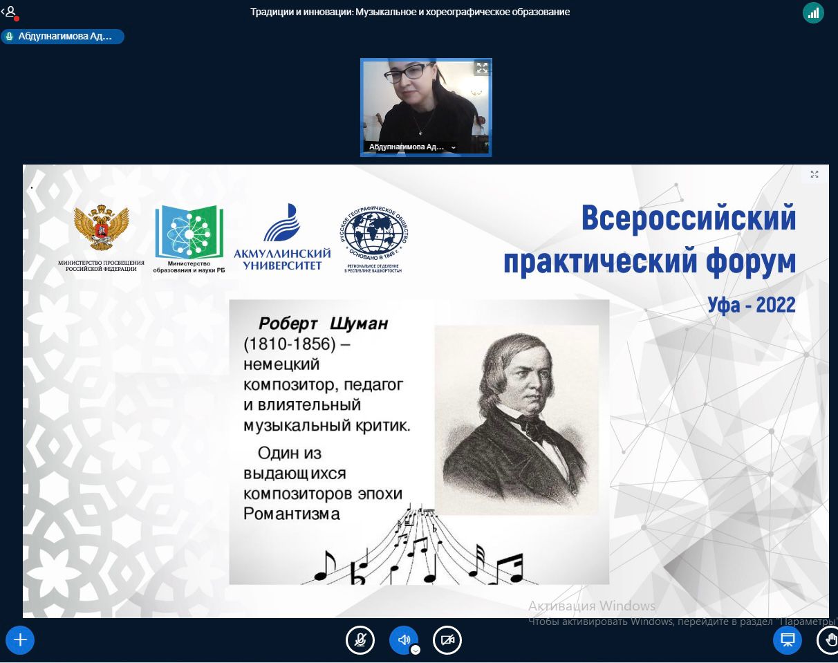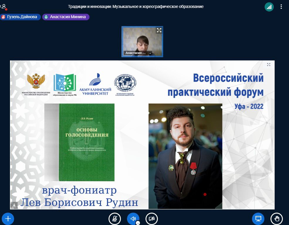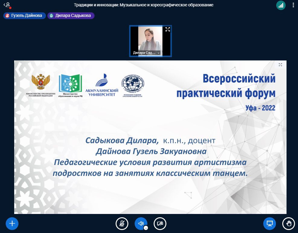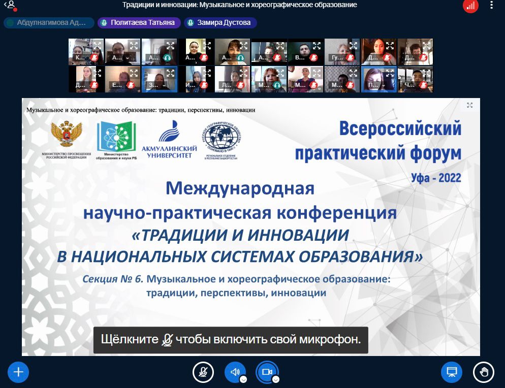 3 декабря 2022 года в рамках Международной научно-практической конференции «Традиции и инновации в национальных системах образования» на кафедре музыкального и хореографического образования  БГПУ им.М.Акмуллы прошла онлайн-секция «Музыкальное и хореографическое образование: традиции, перспективы, инновации». Модераторами секции являлись заведующий кафедрой МХО, к.п.н., доцент Татьяна Ивановна Политаева и старший преподаватель Адель Ирековна Абдулнагимова.