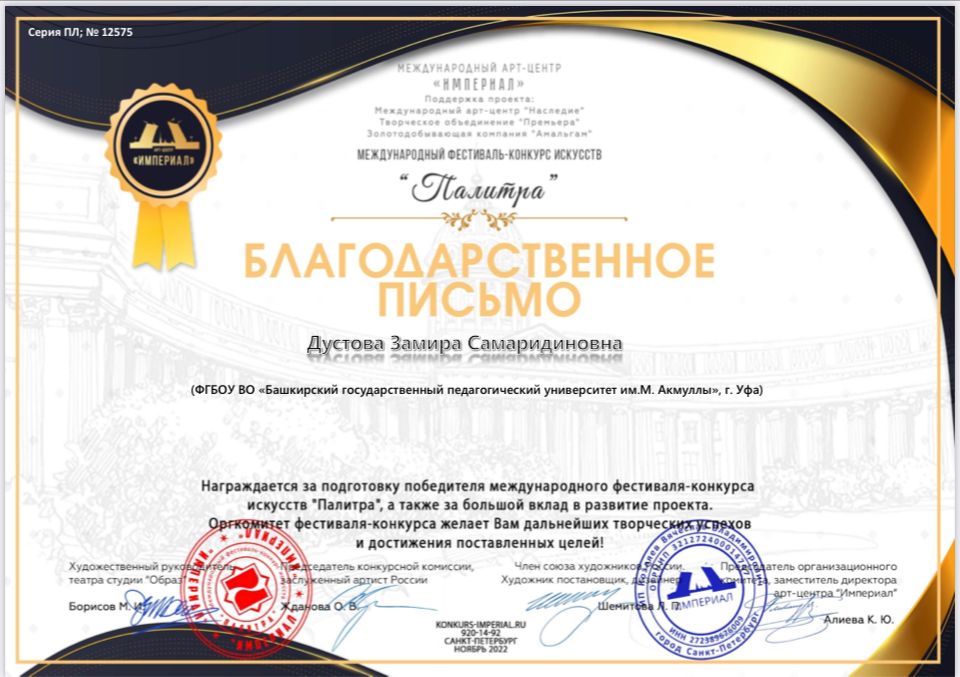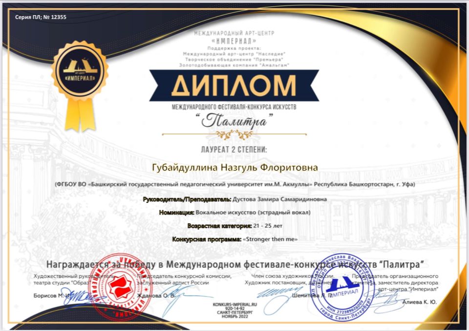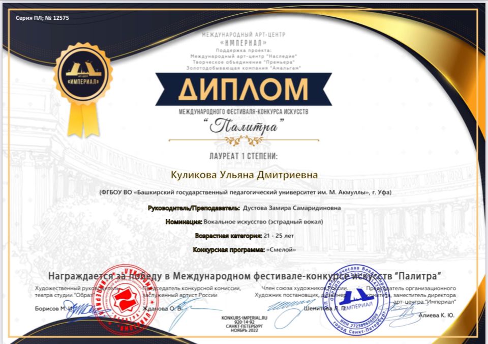Студенты кафедры музыкального и хореографического образования Института педагогики БГПУ им. М. Акмуллы  вошли в число победителей и призеров Международного фестиваля-конкурса искусств «Палитра», который проходил в г. Санкт-Петербург в дистанционном формате.