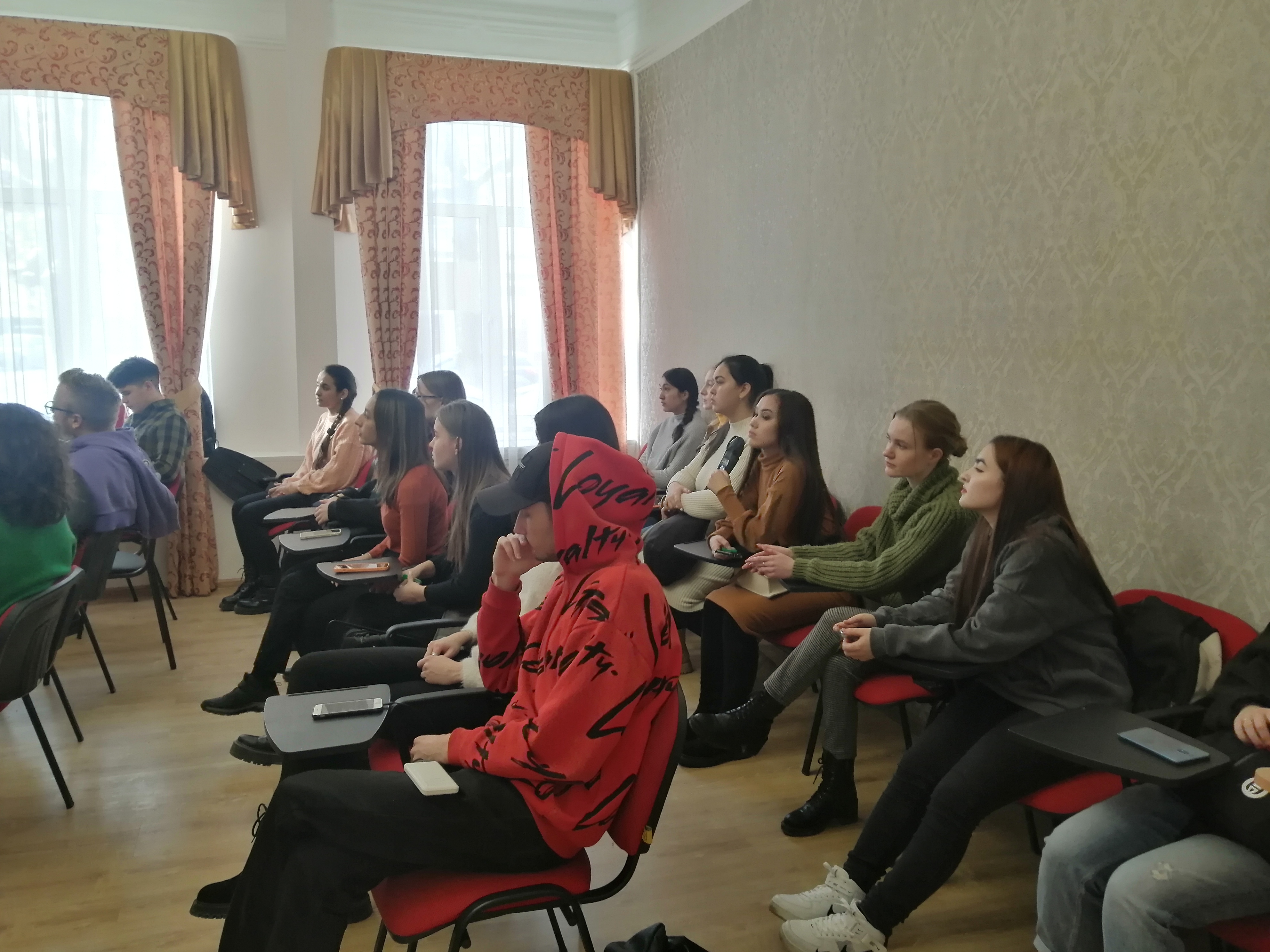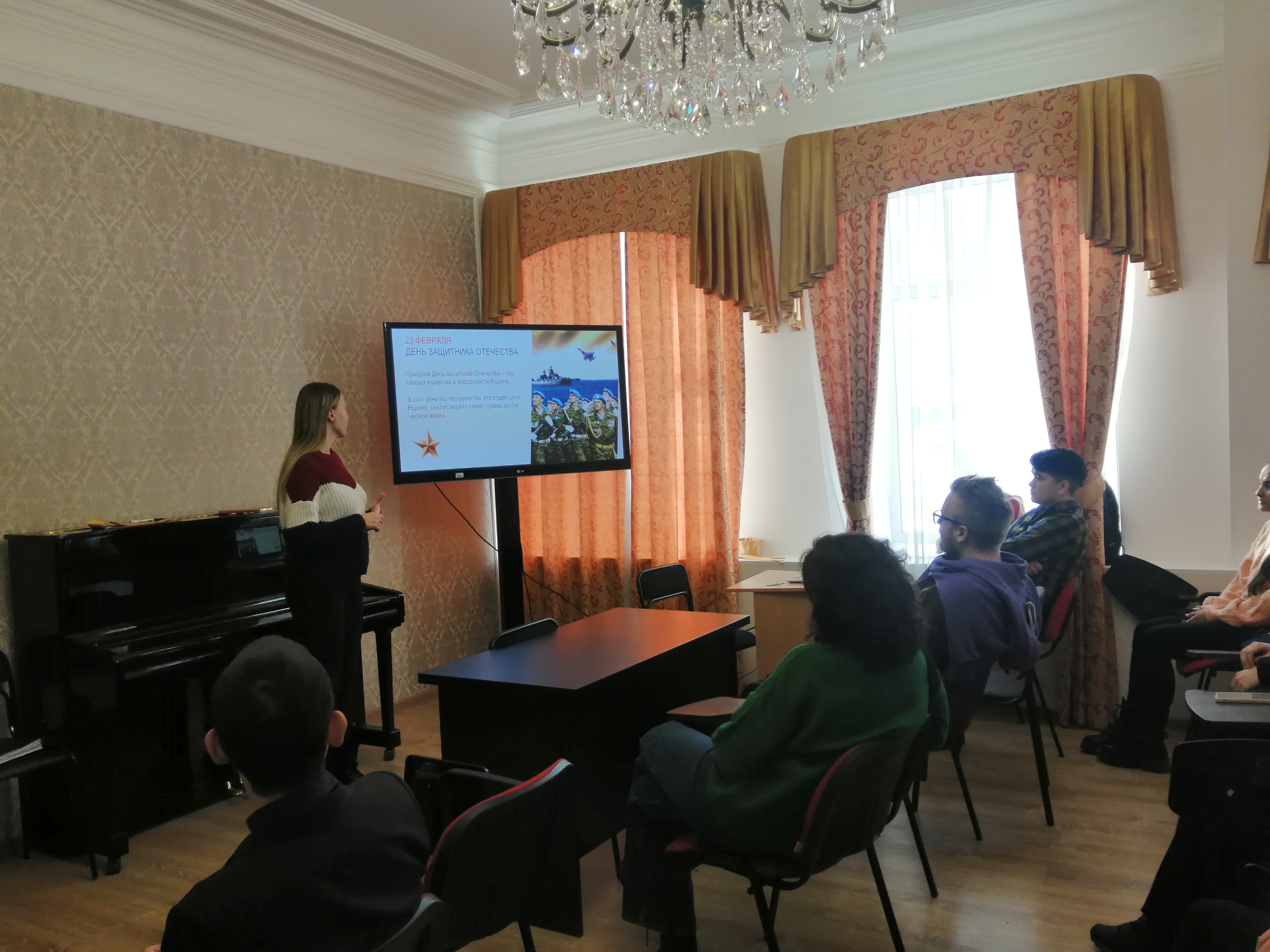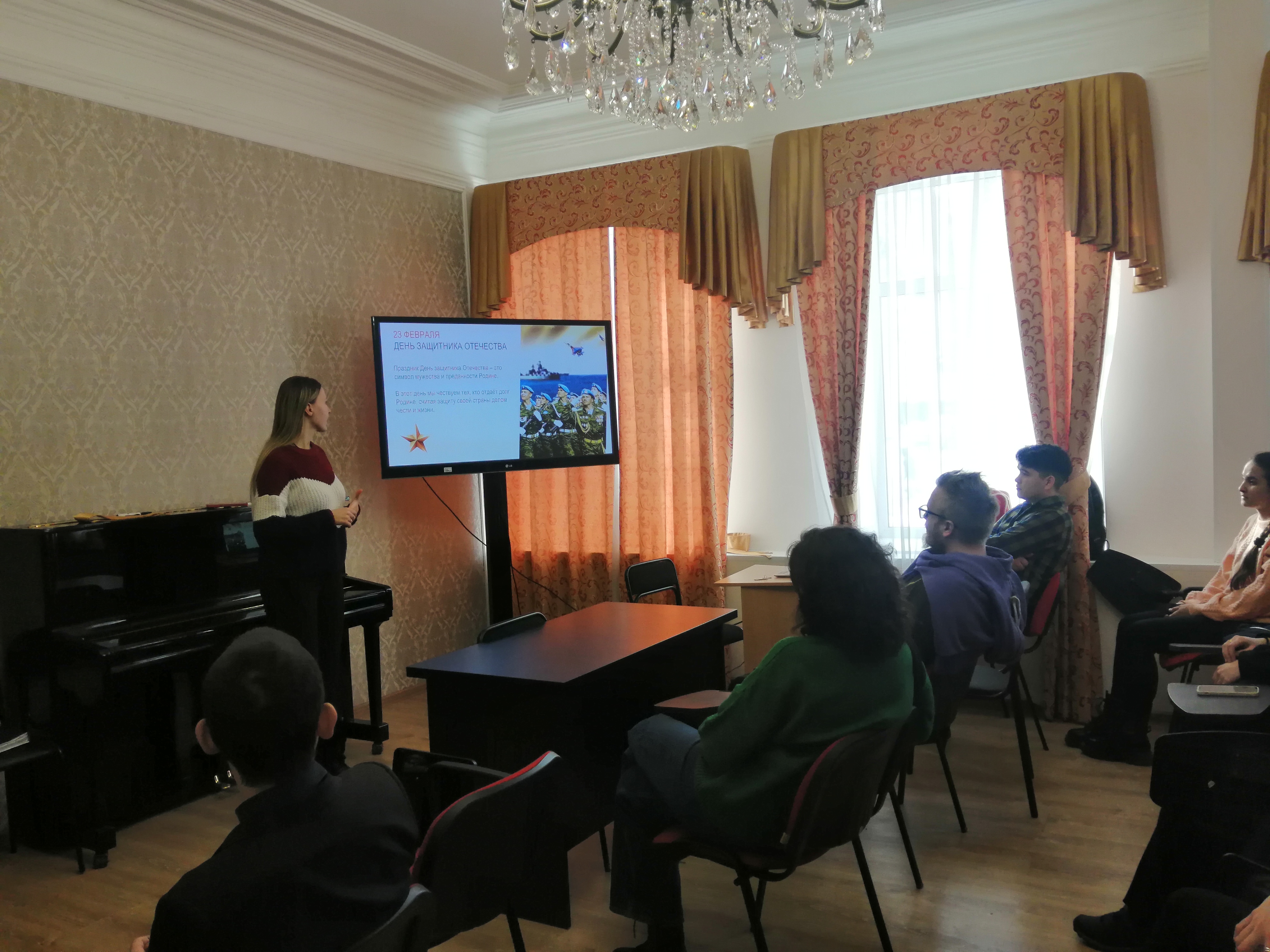 20.02.2023 г. состоялась беседа на тему "День защитника Отечества (23 февраля). Героизм и мужество участников специальной военной операции" в рамках тематического плана занятий "Разговоры о важном". Студентка 5 курса ПОМО_АНЯ-51-18 Дарья Захарова пообщалась со студентами 1 и 2 курсов на тему День защитника Отечества.