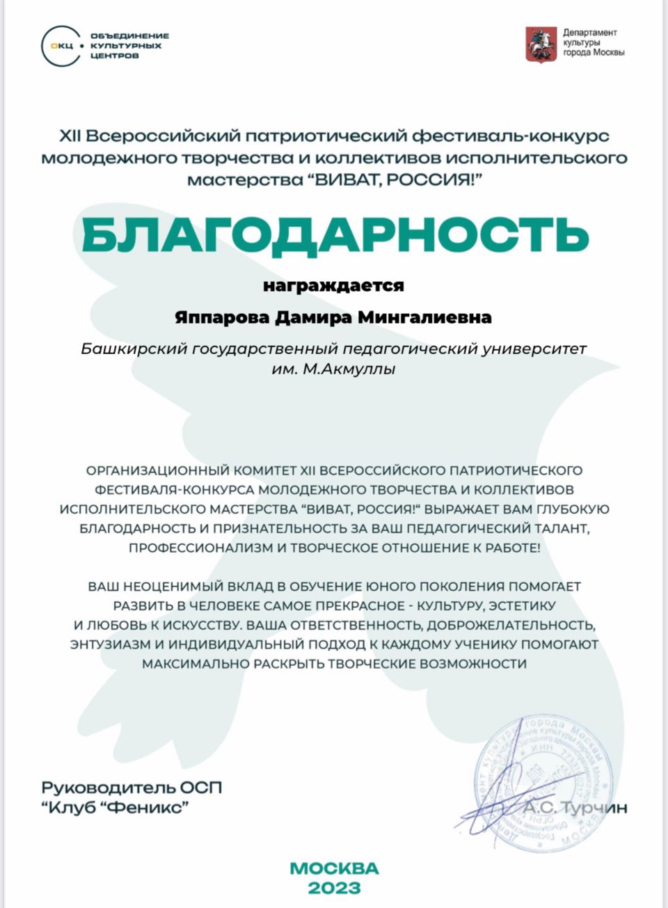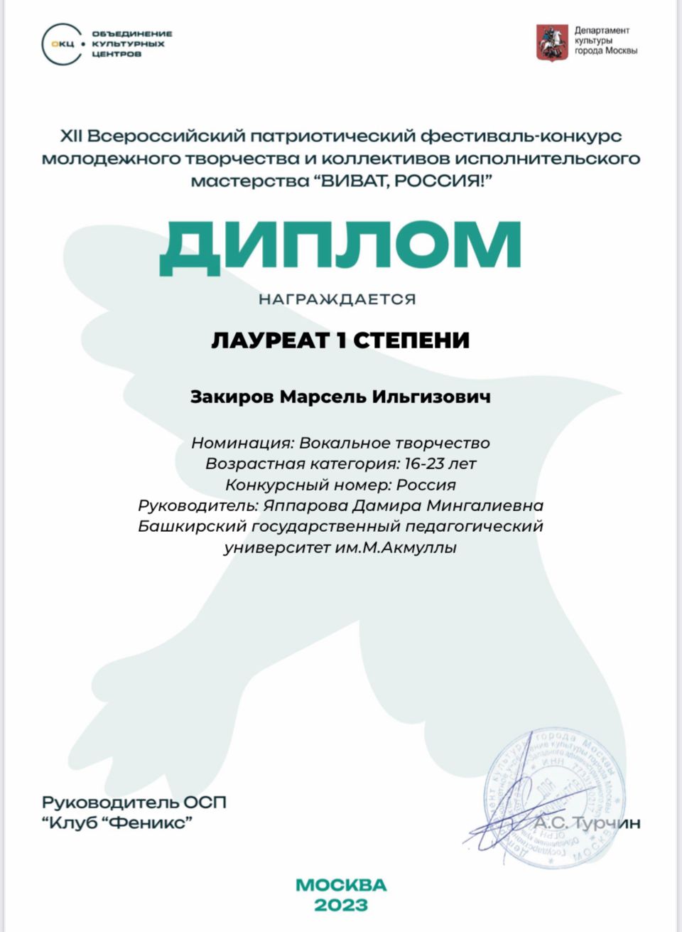 Студент 4 курса кафедры музыкального и хореографического образования Закиров Марсель стал лауреатом I степени ХII Всероссийского патриотического фестиваля-конкурса молодёжного творчества и коллективов исполнительского мастерства "ВИВАТ, РОССИЯ!"