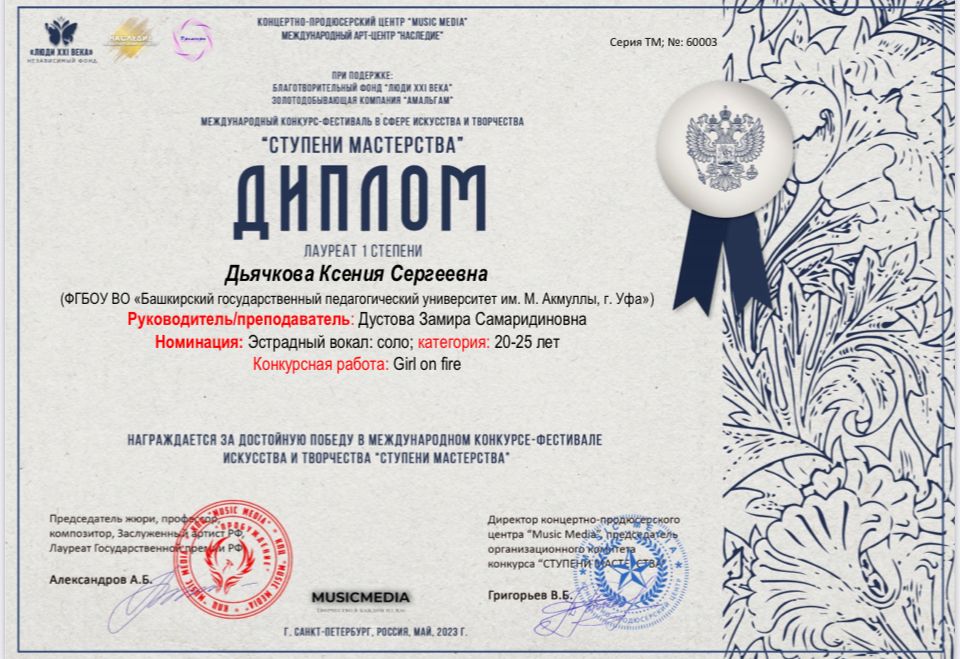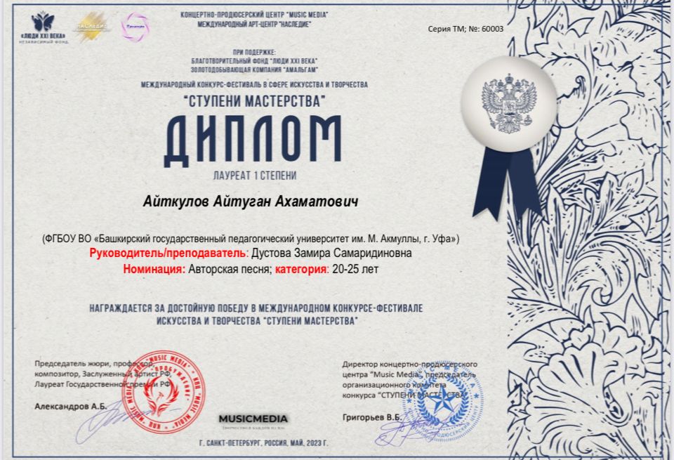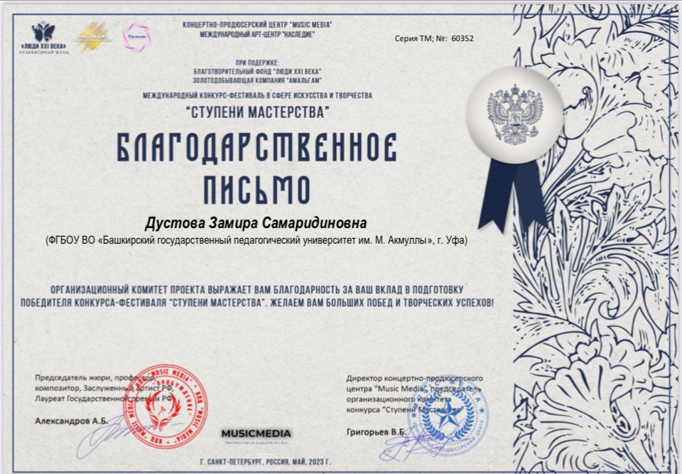 В июне 2023 года в г. Санкт-Петербург состоялся  Международный конкурс-фестиваль в сфере искусства и творчества «Ступени мастерства». в котором приняли участие  студенты кафедры музыкального и хореографического образования Института педагогики БГПУ им. М. Акмуллы.