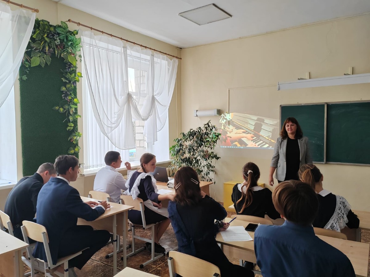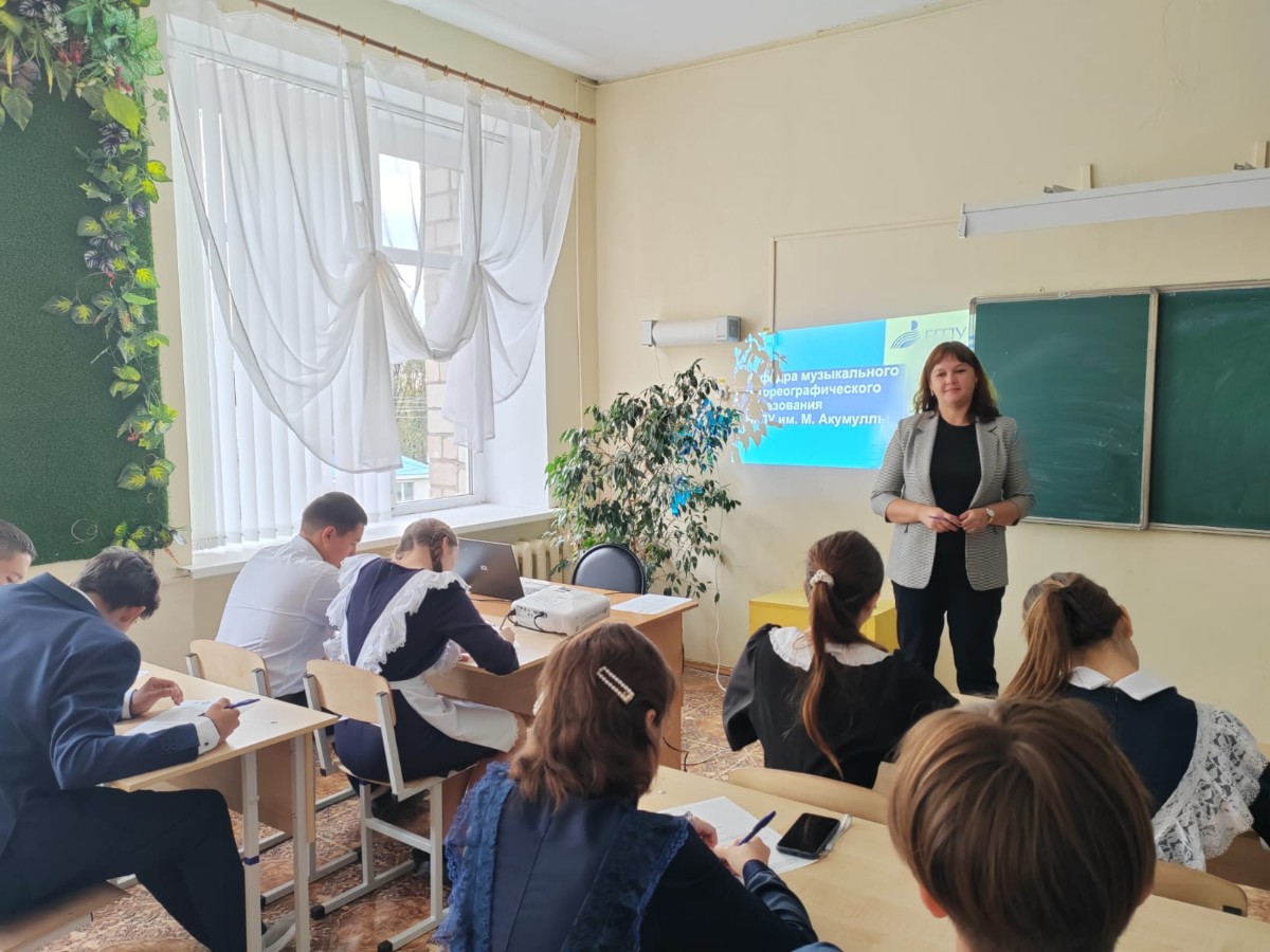 6 октября 2023 г. профессор кафедры музыкального и хореографического образования БГПУ им.М.Акмуллы Ирма Рашитовна Тагариева встретилась с обучающимися 11 класса МОБУ «Лицей д. Кабаково» МР Кармаскалинский район Республики Башкортостан.