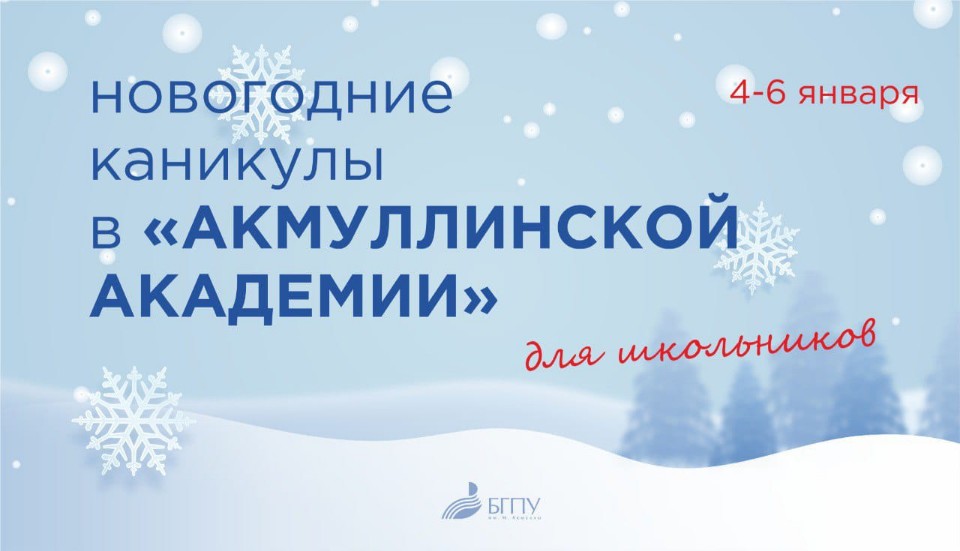 С 4 по 7 января в  БГПУ имени Акмуллы пройдет зимняя «Акмуллинская академия». В дни зимних каникул вуз подготовил для школьников Башкирии специальные образовательные смены. Познавательные, творческие и спортивные мероприятия ждут учащихся разных возрастов – от начальной школы до старшеклассников.