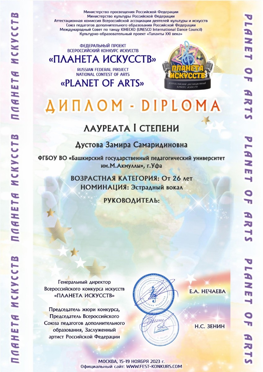 В ноябре 2023 года в Москве прошел Федеральный проект – Всероссийский конкурс искусств «Планета искусств», организованный Министерством просвещения РФ, Министерством культуры РФ, Аттестационной комиссией Всероссийской ассоциации деятелей культуры и искусств.
