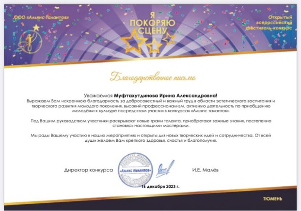 16 декабря 2023 года Театр хореографического мастерства «Гранд» под руководством старшего преподавателя Муфтахутдиновой И. А. принял участие в III Всероссийском фестивале-конкурсе "Я покоряю сцену" (г.Тюмень, 2023) с китайским танцем и стал лауреатом 2 степени.