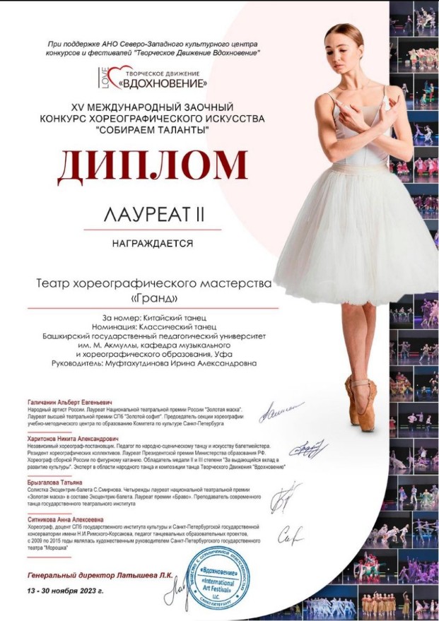 Театр хореографического мастерства «Гранд» под руководством старшего преподавателя Муфтахутдиновой И. А. кафедры музыкального и хореографического образования стал Лауреатом II степени XV  Международного конкурса хореографического искусства «Собираем таланты» в номинации «Классический танец» .
