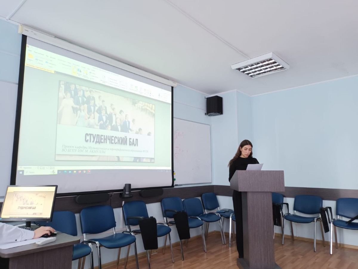 Студенты кафедры музыкального и хореографического образования представили три проекта: "Слово Акмуллы" - студентка 1 курса Юлия Буракова (рук. преподаватель Бакиев Р.Р.), "Межвузовский студенческий бал, посвященный Году семьи" - студентка 3 курса Шахадат Рахимова (рук. преподаватели Захарова Д. Ю. и Салмин А. В.), "Музыка в Арт-квадрате" - студентки 1 курса Аделя Каримова и Зарина Фатихова (рук. преподаватель Рахматуллина А. И.).