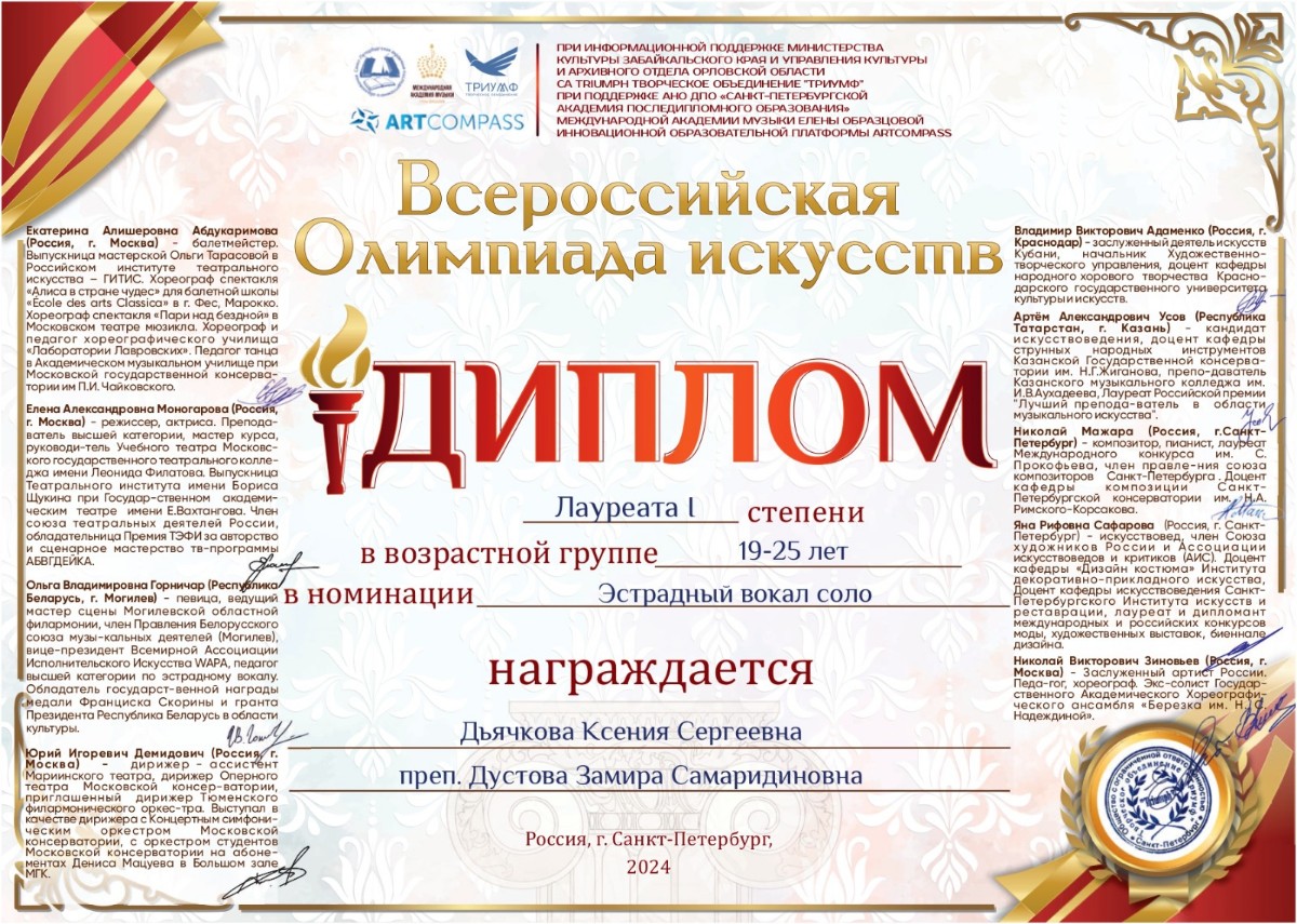 В январе 2024 г. в Санкт-Петербурге состоялась Всероссийская олимпиада искусств при поддержке Министерства культуры Забайкальского края и Управления культуры и архивного отдела Орловской области, в которой приняла участие студентка 3 курса кафедры музыкального и хореографического образования Ксения Дьячкова.