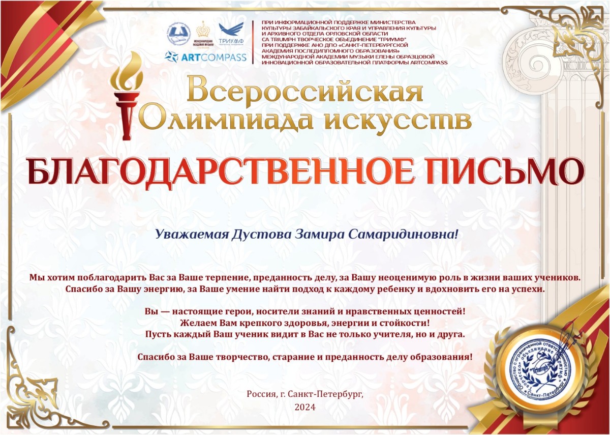 Старший преподаватель Замира Дустова была награждена Благодарственным письмом за преданность делу и неоценимую роль в жизни учеников.