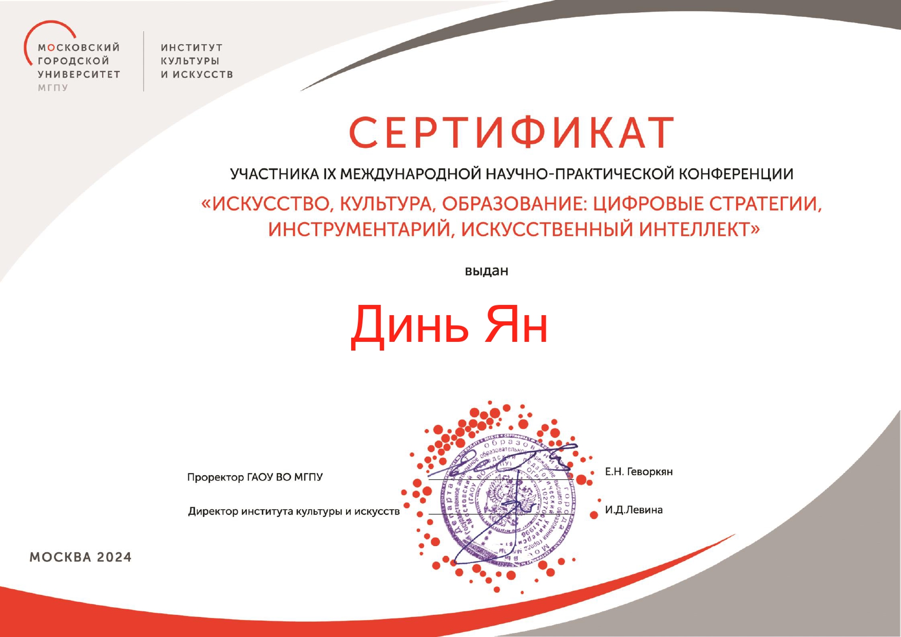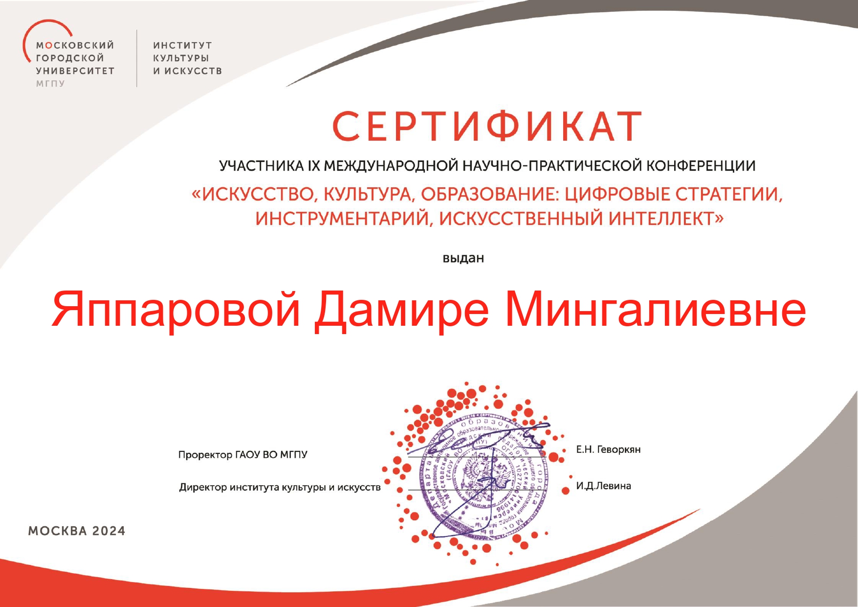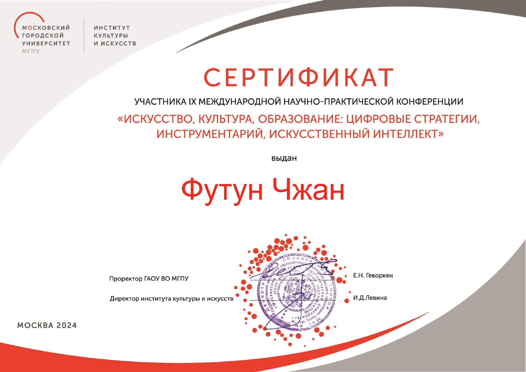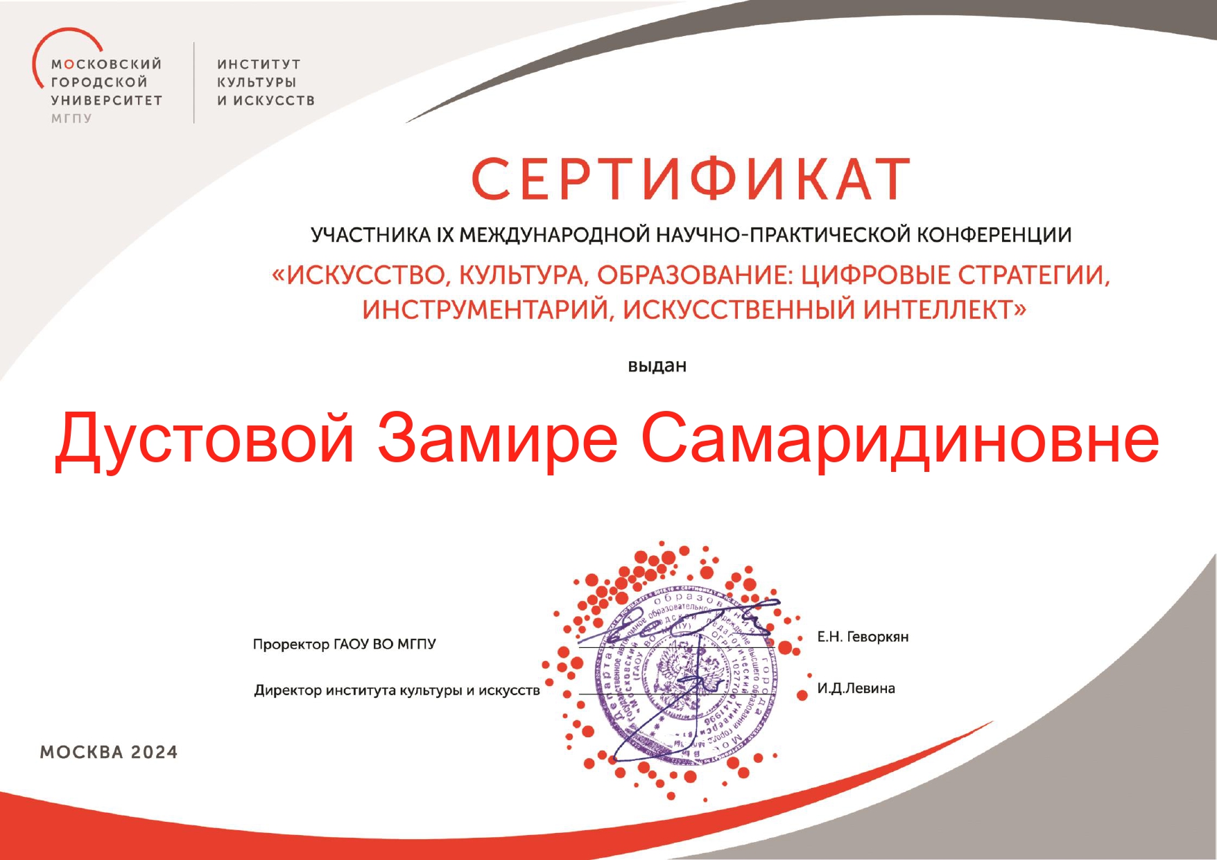 10 апреля преподаватели кафедры музыкального и хореографического образования: к.п.н., доцент, заведующая кафедрой Т.И. Политаева, доцент Д.М. Яппарова, старший преподаватель З.С. Дустова, старший преподаватель Г.Р. Камалиева, а также аспиранты кафедры Д. Ян и Ф. Чжан приняли участие в пленарном заседании IХ Международной научно-практической конференции «Искусство, культура, образование: цифровые стратегии, инструментарий, искусственный интеллект», проводимой Московским городским педагогическим университетом.
