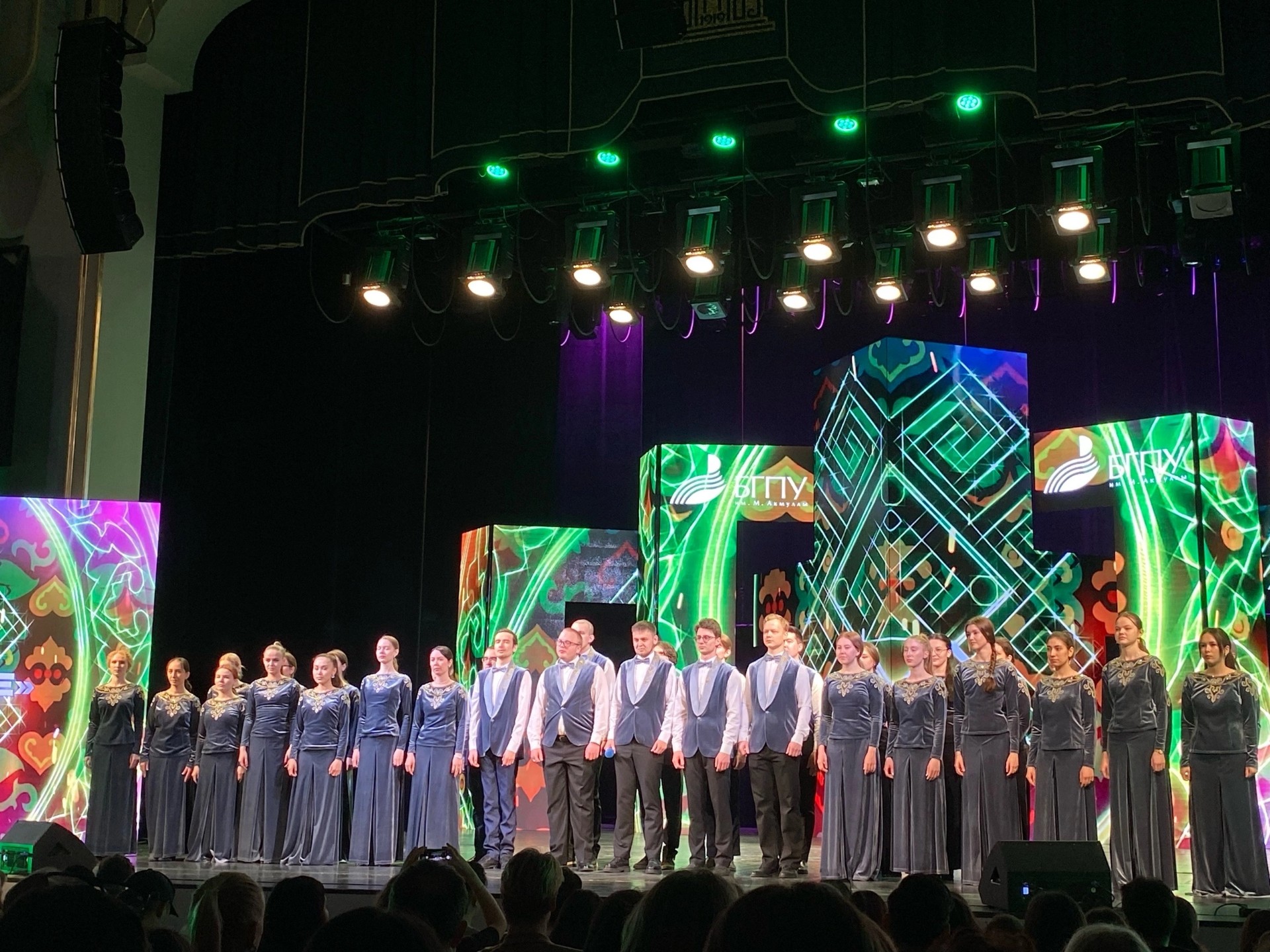 На сцене театра выступили Народный коллектив Хор "Кантанте" под руководством к. п. н., доцента Каримовой Л. Н. и студенты профиля "Художественное образование (хореография)" кафедры музыкального и хореографического образования. Они показали яркие номера на высшем уровне.