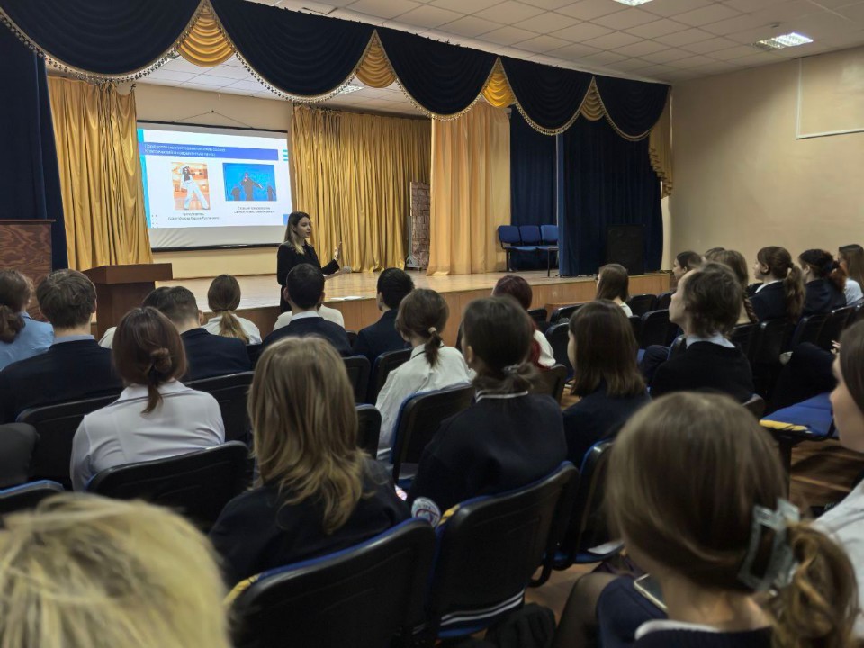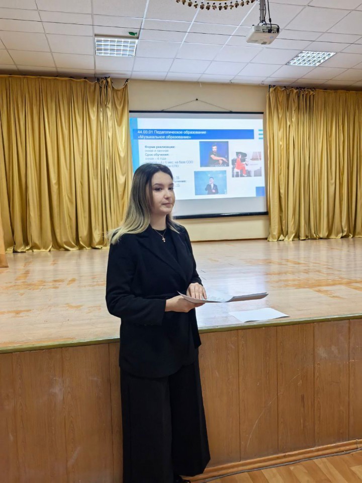 Студентка 4 курса музыкального отделения Ульяна Куликова рассказала обучающимся о направлениях подготовки кафедры, вступительных испытаниях, сроках подачи документов, условиях приемной кампании 2025 года.
