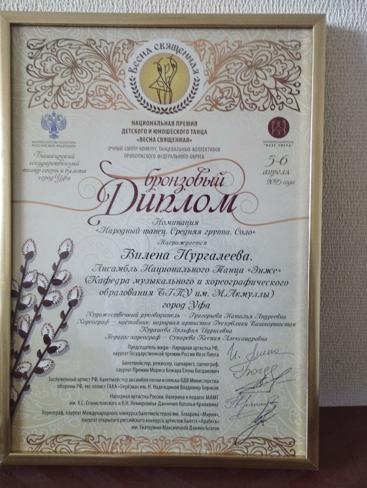 В этом году в конкурсе приняли участие 27 хореографических коллективов Приволжского Федерального округа. Среди них — Ансамбль Национального Танца "ЭНЖЕ", который представил свою визитную карточку — башкирский танец "Озорная внучка". Этот танец, поставленный Заслуженным работником культуры РБ Рифхатом Саттаровым, был исполнен солисткой Виленой Нургалеевой под руководством педагога-наставника, Народной артистки РБ Зульфии Кудашевой.   Жюри премии, состоящее из признанных мастеров хореографии, оценивало выступления с особым вниманием и строгостью. В состав жюри вошли:   Наталья Крапивина — Народная артистка РФ, педагог Московского академического Музыкального театра им. К.С. Станиславского и Вл.Ив. Немировича-Данченко.   Владимир Борисов — Заслуженный артист России, балетмейстер ансамбля песни и пляски ВДВ Министерства обороны РФ, экс-солист государственного академического хореографического ансамбля «Березка» им. Надежды Надеждиной.   Елена Богданович — балетмейстер, режиссер, сценарист, сценограф, лауреат премии Мориса Бежара и премии «Золотая маска» (Польша), мастер-хореограф Национальной премии «Весна священная».   Даниил Благов — хореограф, лауреат международных конкурсов балетмейстеров им. Захарова «Мария» и открытого российского конкурса артистов балета «Арабеск» им. Екатерины Максимовой, преподаватель Российского государственного университета имени Косыгина.   Илзе Лиепа — председатель жюри, Народная артистка России, лауреат Государственной премии РФ.   Помимо конкурсной программы, участники и гости могли принять участие в образовательных мероприятиях: круглых столах, мастер-классах и практикумах. Эти занятия охватывали широкий спектр тем — от классического и народного танца до режиссуры и работы над костюмами. Особое внимание уделялось развитию выразительности и юмора в танце, а также индивидуальным консультациям для руководителей и педагогов.   Выступление Вилены Нургалеевой в башкирском танце "Озорная внучка" оставило неизгладимое впечатление на жюри. Ее танец, полный энергии и задора, был высоко оценен, и результатом стал Бронзовый Диплом. Это достижение — не только личная победа Вилены, но и успех всего ансамбля "ЭНЖЕ".
