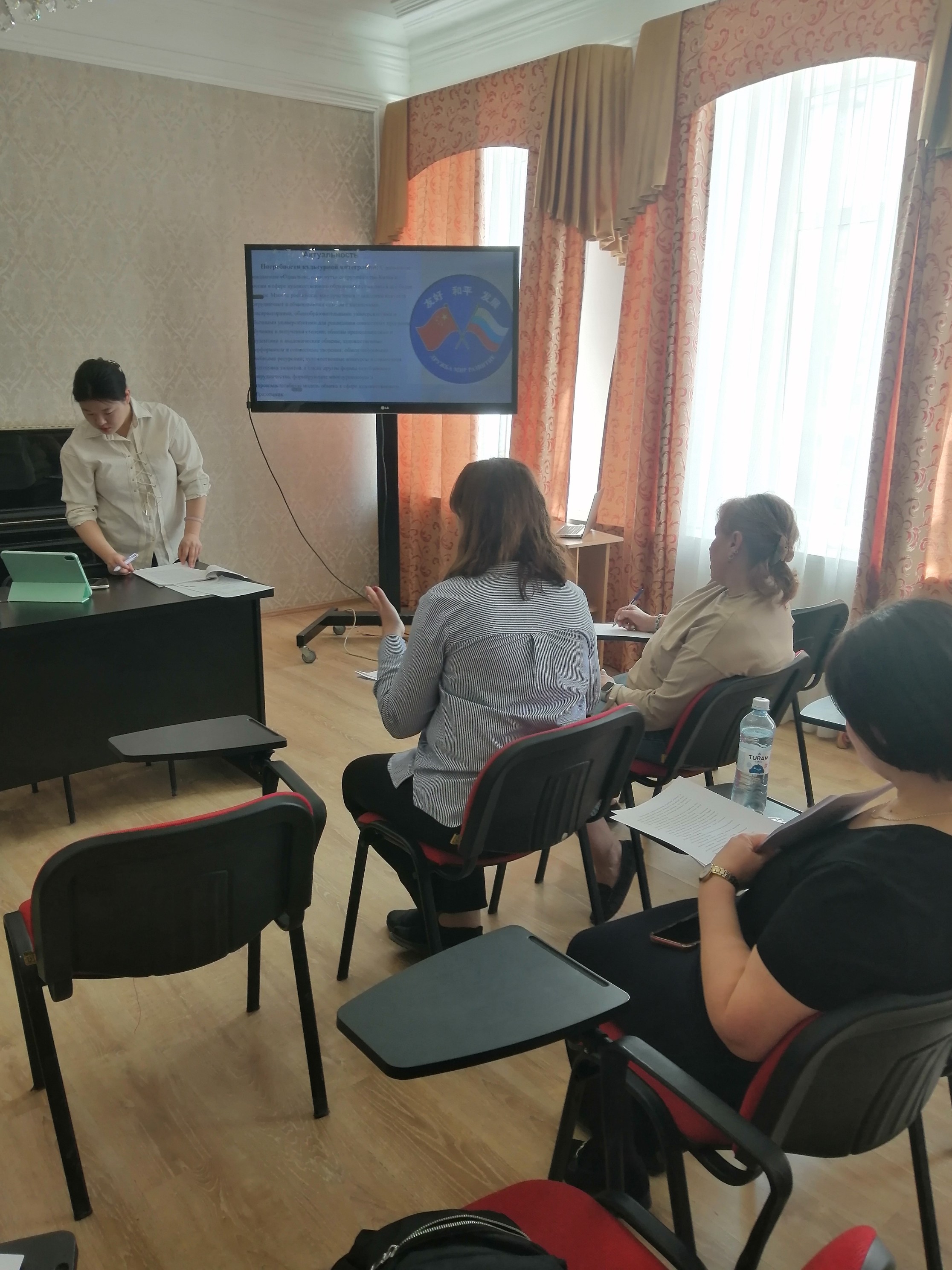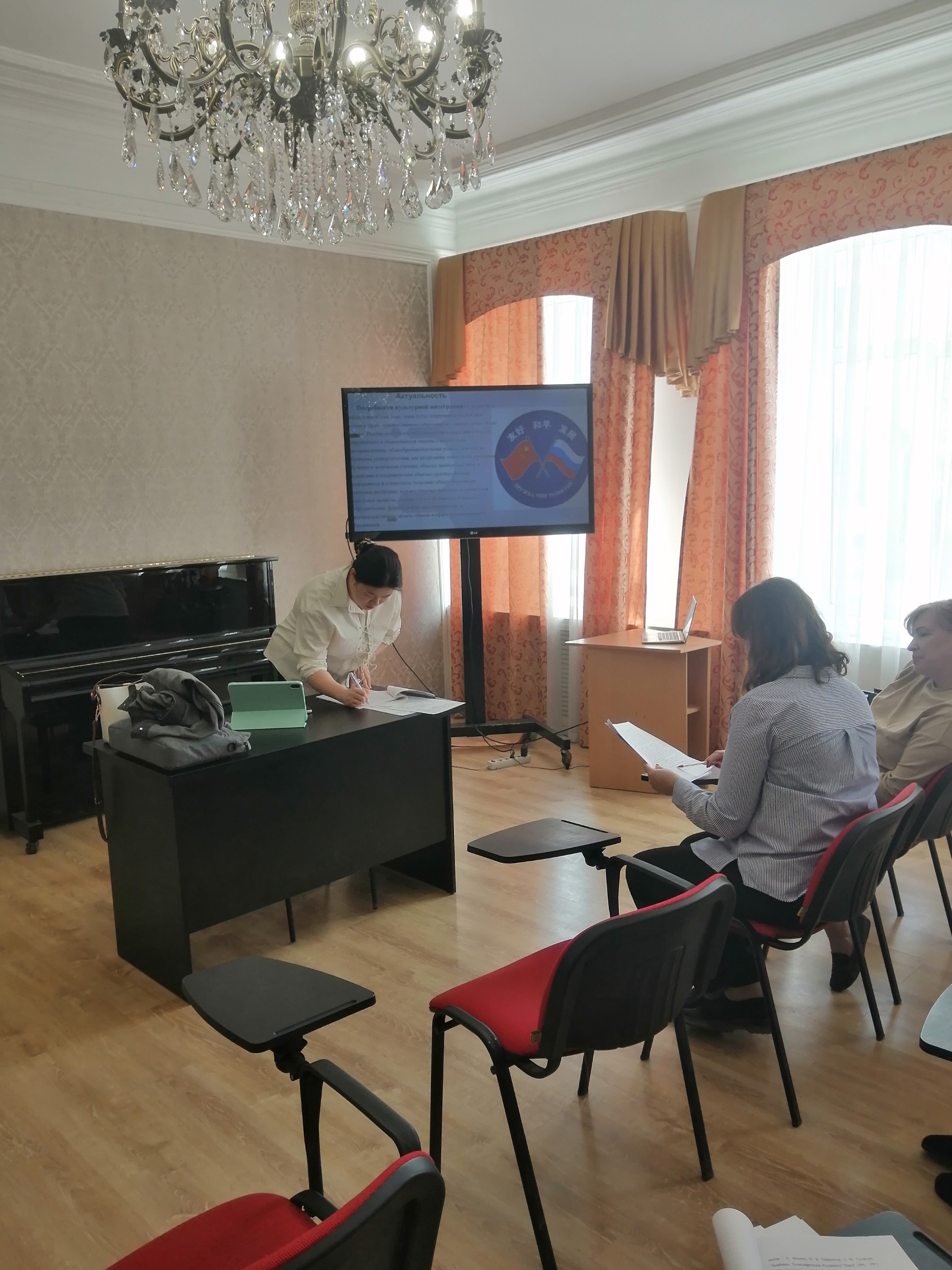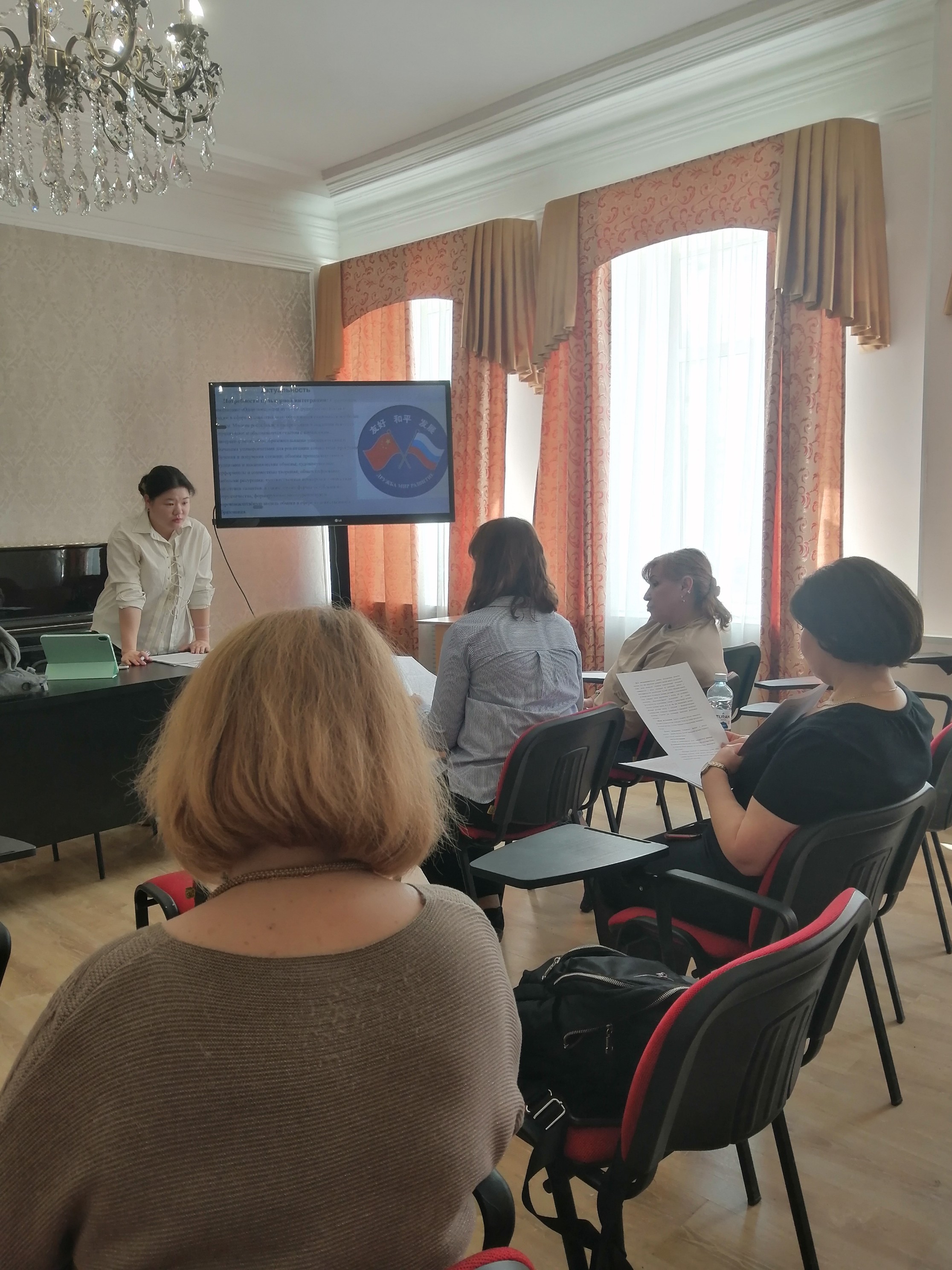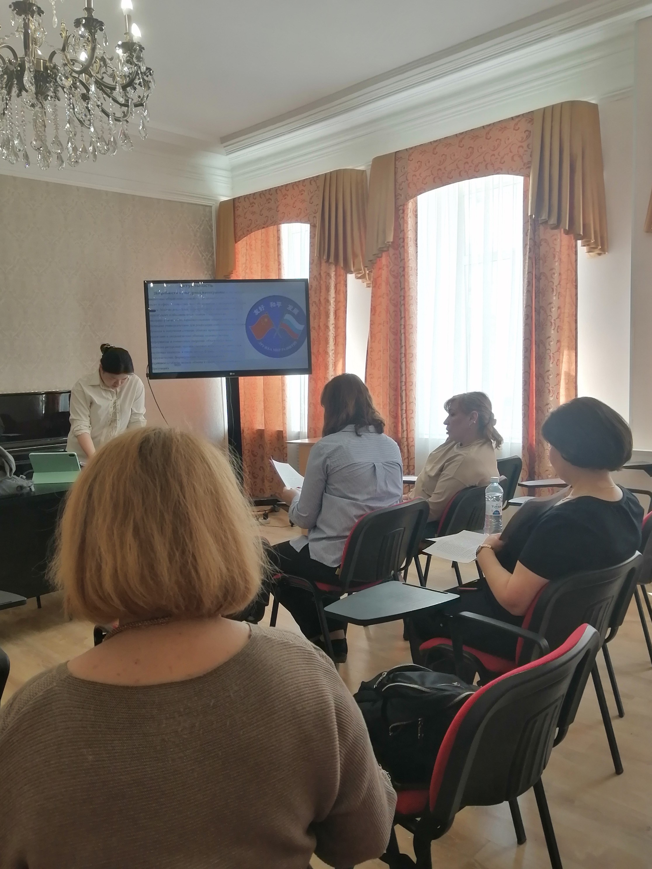 Аспирантка представила свои результаты разработки за первый год обучения, ответила на вопросы экспертов кафедры по теме исследования, связанной с развитием навыков обучения русской вокальной музыке студентов педагогических колледжей Китая.