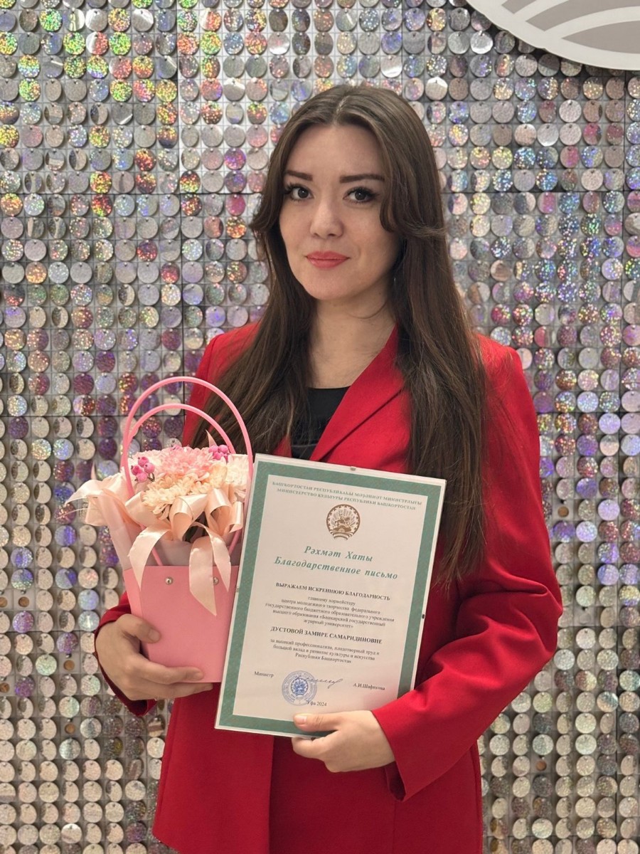 Доцент кафедры музыкального и хореографического образования Замира Дустова награждена Благодарственным письмом Министерства культуры Республики Башкортостан за высокий профессионализм, плодотворный труд и большой вклад в развитие культуры и искусства Республики Башкортостан.