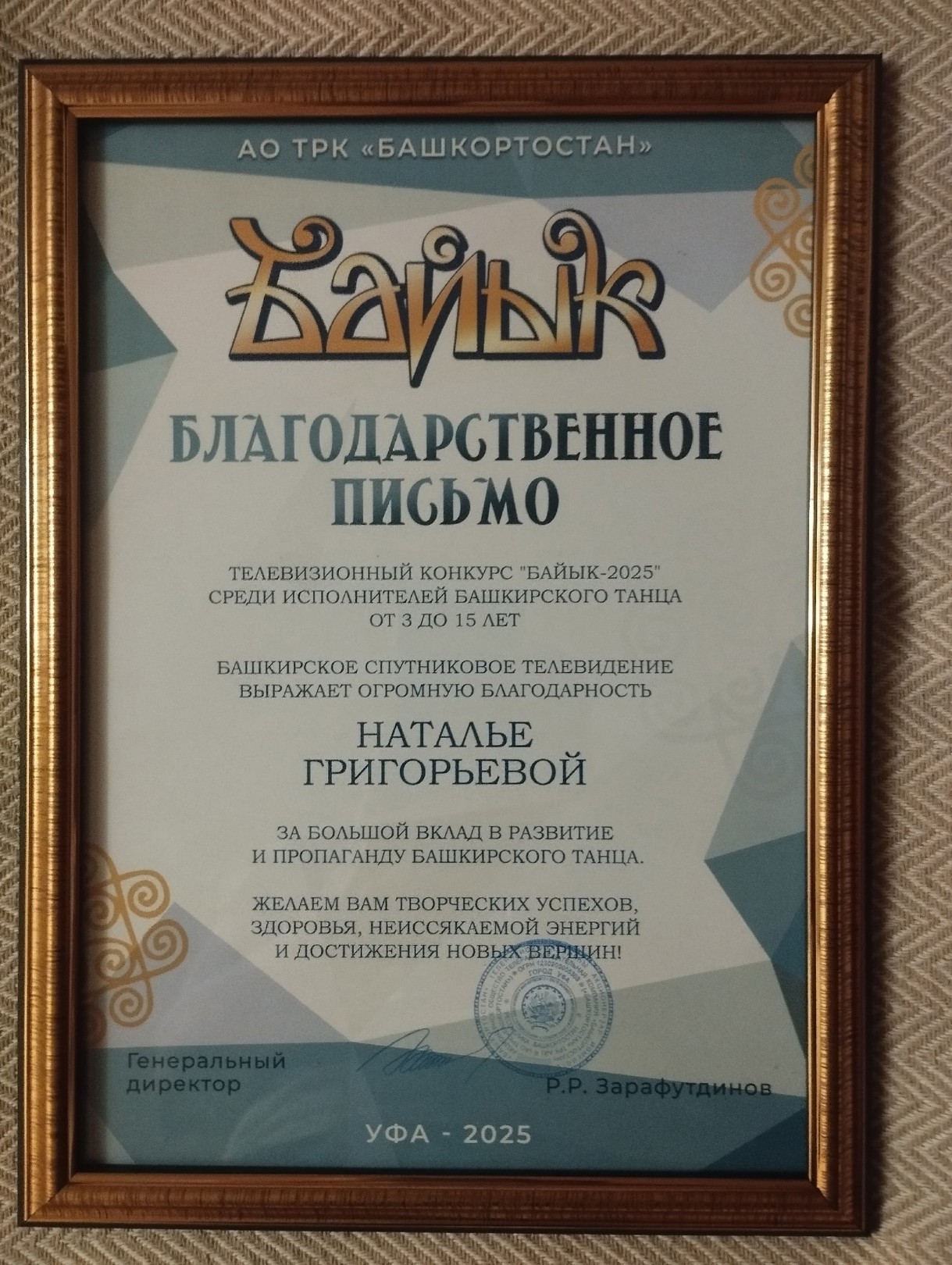 В Гала-концерте выступили солистки Ансамбля Национального Танца «ЭНЖЕ» Вилена Нургалеева и Вероника Аднабаева. Они заняли второе почетное место. Руководитель ансамбля Наталья Григорьева получила благодарственное письмо от АО ТРК «Башкортостан» за большой вклад в развитие и пропаганду башкирского танца.