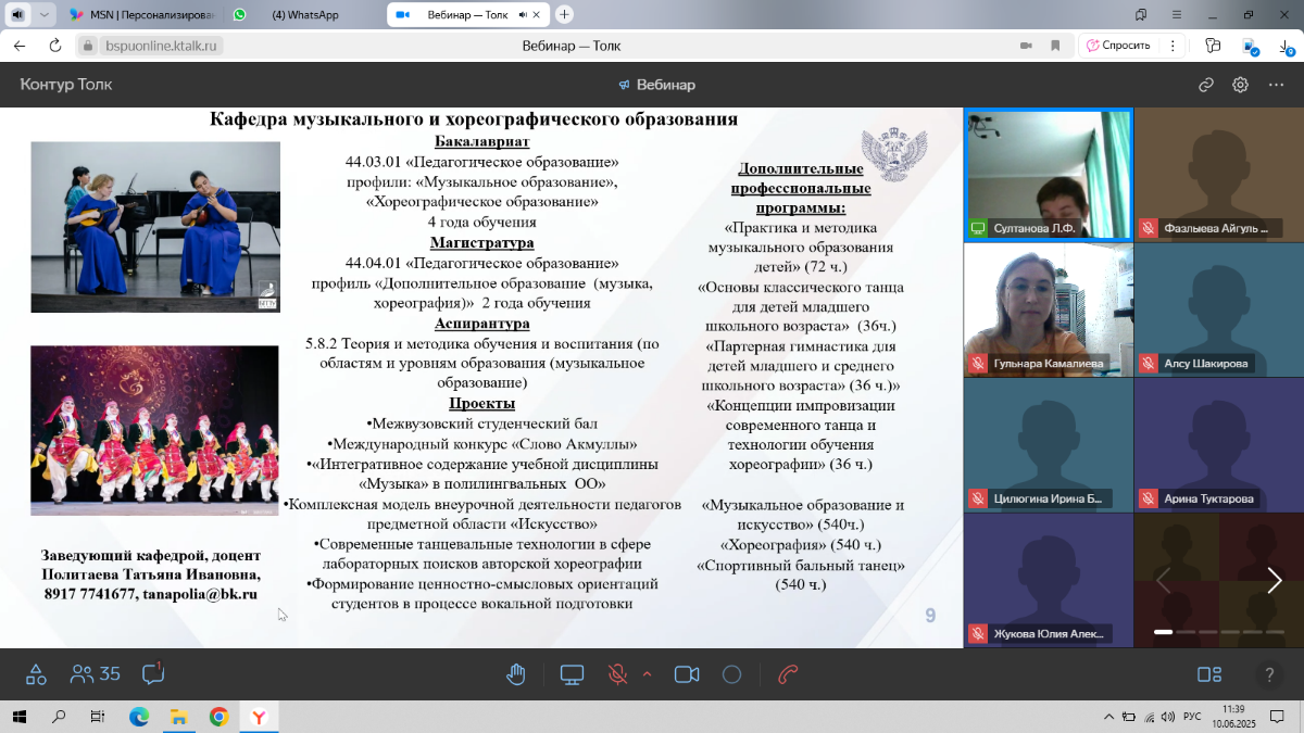 На вебинаре с колледжами Республики Башкортостан выступила старший преподаватель кафедры Камалиева Гульнара Раильевна. Она рассказала выпускникам колледжей о направлениях работы кафедры, о вступительных испытаниях, о творческих проектах, о мероприятиях и концертных выступлениях, о перспективах обучения на направлениях музыкальное образование и хореографическое образование, о потенциальной возможности трудоустройства в период обучения, о реализации творческих способностей.