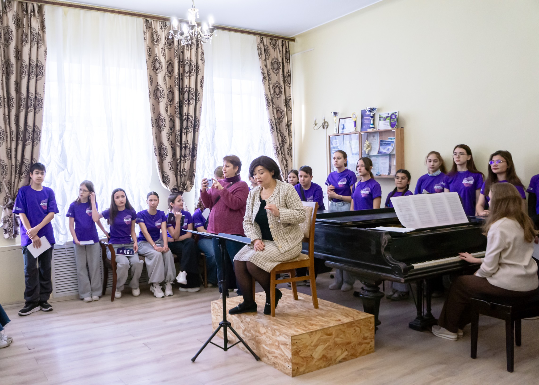 Далее встреча продолжилась в концертном зале, где доцент Маргарита Заббарова рассказала будущим абитуриентам о правилах поступления на кафедру и возможностях обучения. Перед участниками выступили студенты с яркими вокальными и инструментальными номерами, продемонстрировав высокий уровень подготовки.