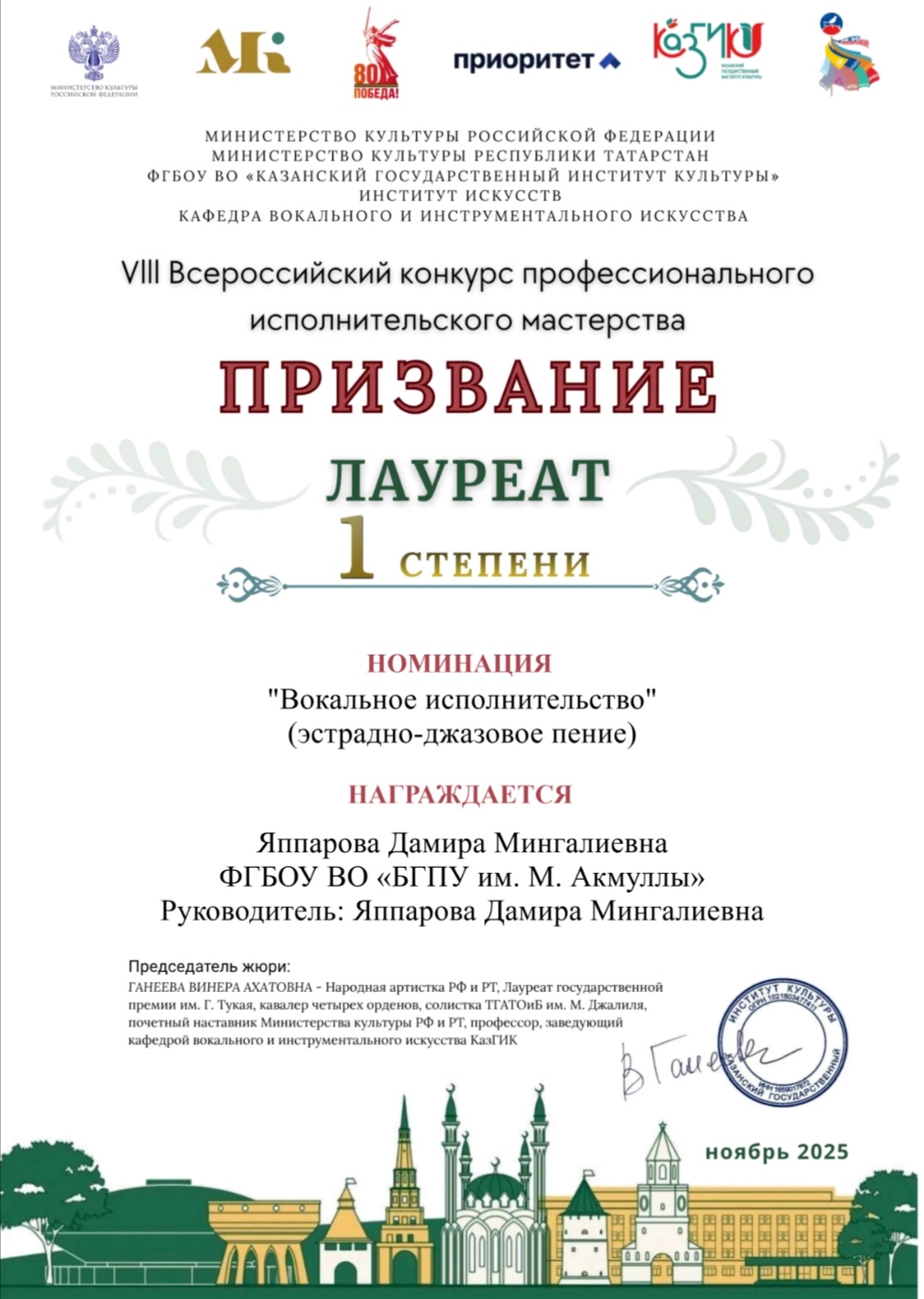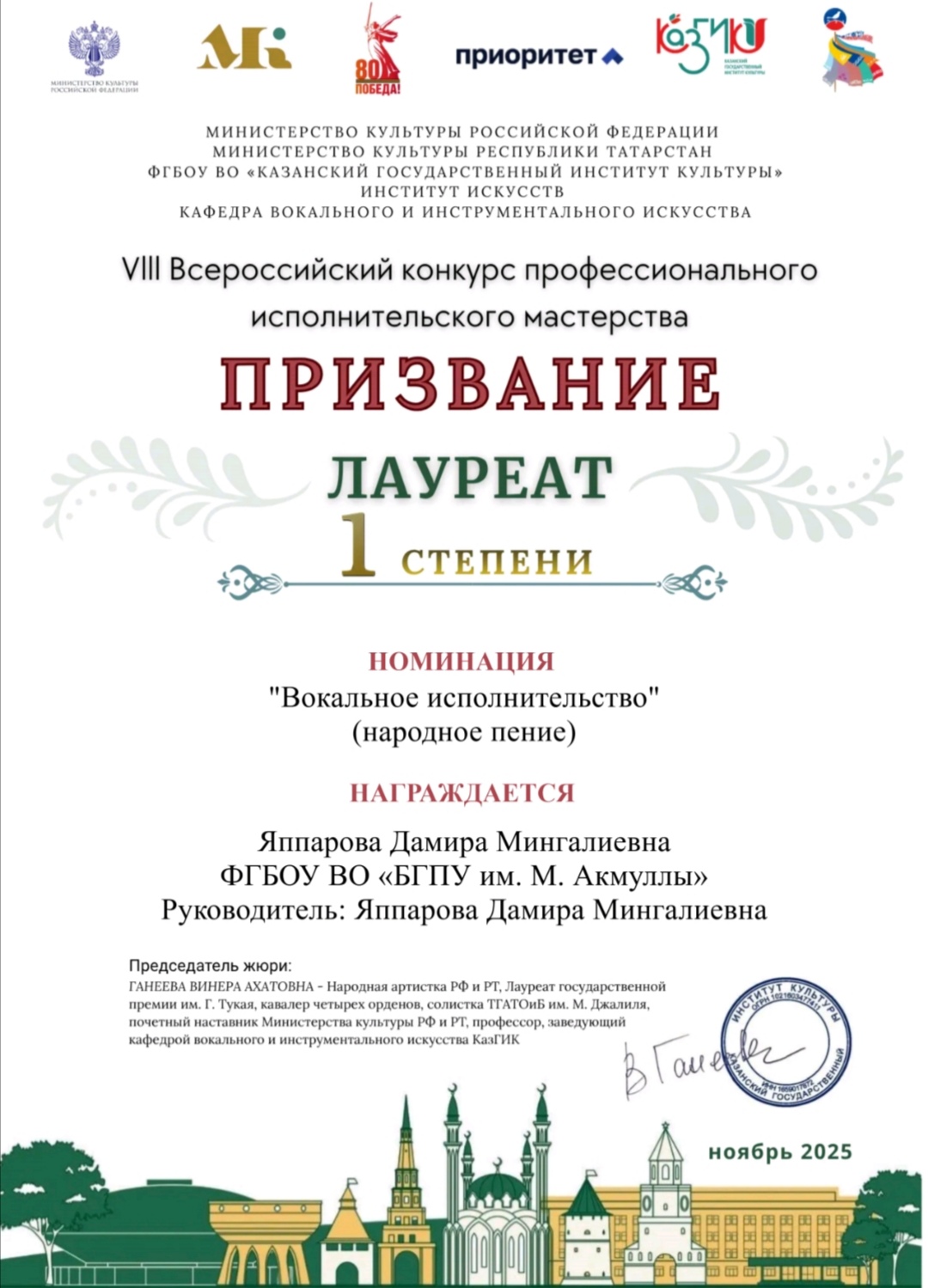 Доцент кафедры музыкального и хореографического образования Яппарова Дамира Мингалиевна стала лауреатом I степени VIII Всероссийского конкурса профессионального исполнительского мастерства «ПРИЗВАНИЕ» в номинации «Вокальное исполнительство» сразу в двух направлениях: народное пение и эстрадно-джазовое пение. Задачи конкурса – выявление и поддержка участников, с целью повышения их профессионализма, педагогического и исполнительского мастерства. Проводится для педагогов профессиональных учреждений культуры и искусств, вузов и ссузов, преподавателей детских музыкальных школ, школ искусств, общеобразовательных и дошкольных учреждений.